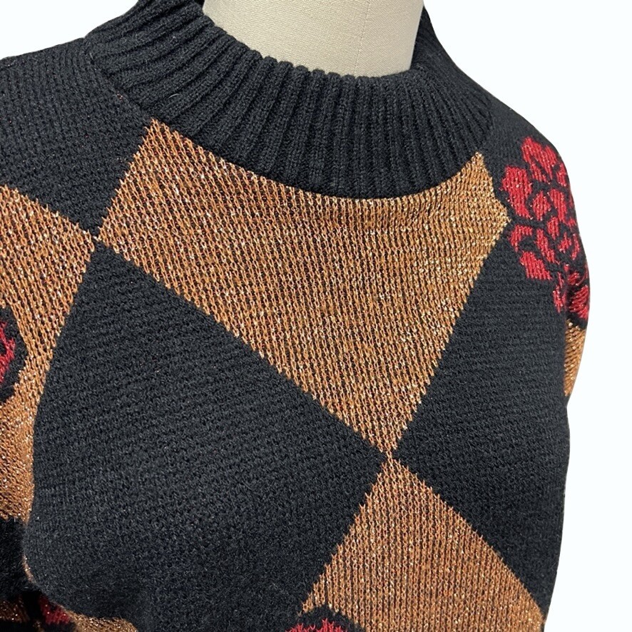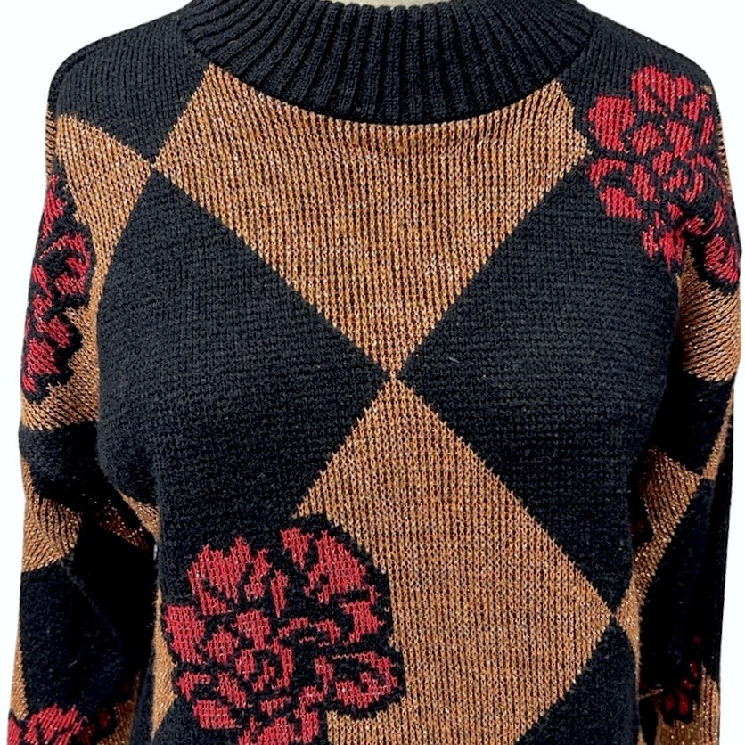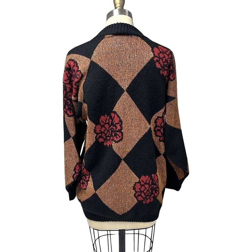 Vintage 1980s Dana Scott sweater in a bold harlequin diamond pattern in black and copper, with red rose motifs scattered across the front. Oversized, drop-shoulder cut, long enough to wear as a mini-dress on a smaller frame. Acrylic knit, no size tag.