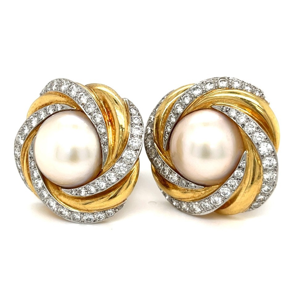 Charles Turi 18k Gold + Platinum Mabe Pearl 3.3ct Diamond Ear Clips 1-3/16" 36g