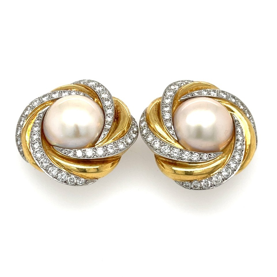 Charles Turi 18k Gold + Platinum Mabe Pearl 3.3ct Diamond Ear Clips 1-3/16" 36g