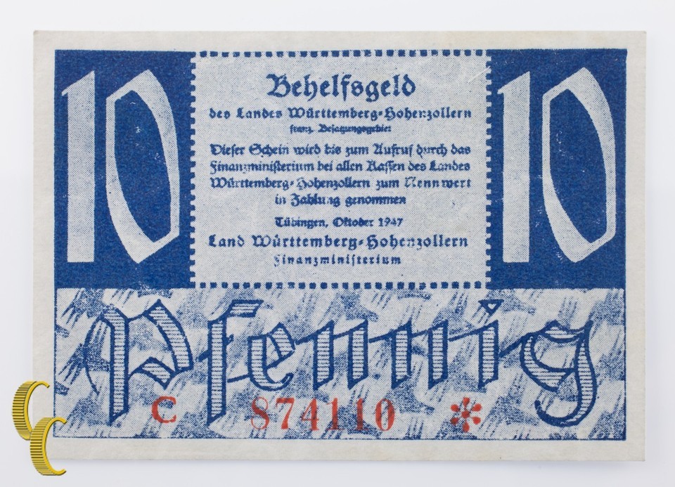 1947 Germany 10 Pfennig fractional currency issue Wurttemberg