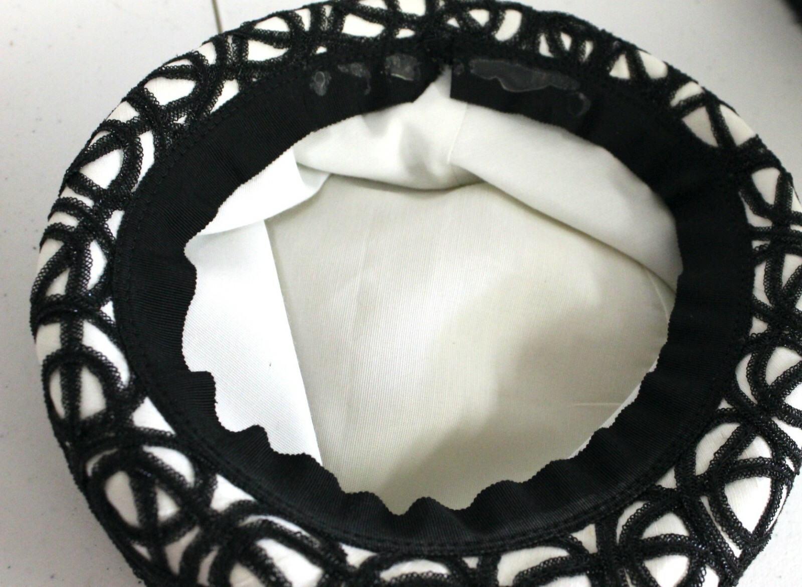 VTG Women's Silk Pillbox Hat 1950s Black White Horsehair Braid Trim Small size 21".