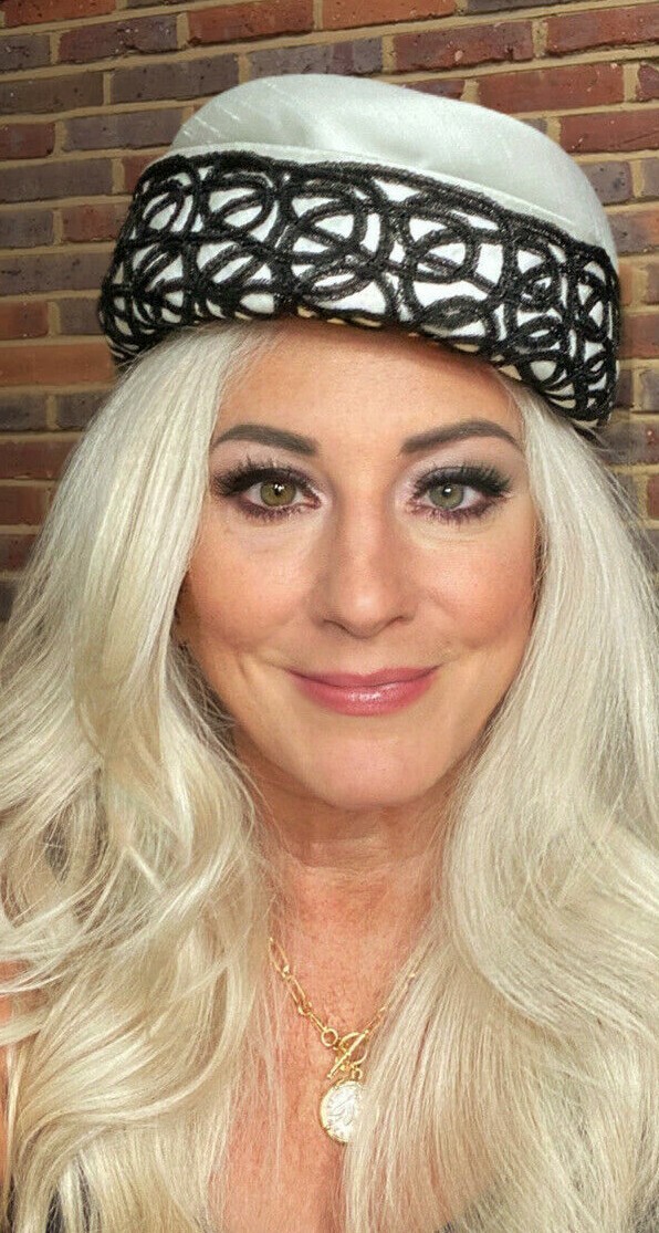 VTG Women's Silk Pillbox Hat 1950s Black & White Horsehair Braid Trim Small