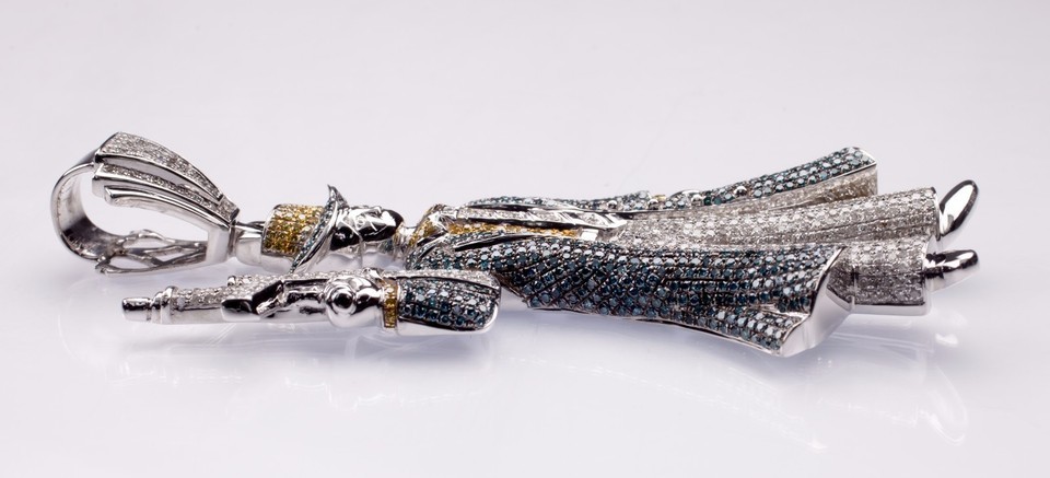 Gangster Pendant Covered in White, Yellow, and Blue Diamonds (Colored Diamonds are Enhanced)