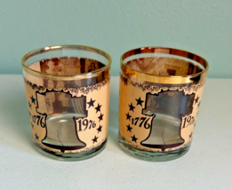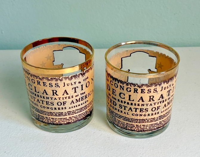 Bicentennial Declaration of Independence Glass Tumblers Set of 2. Celebrate history with these elegant gold and black glasses featuring a Liberty Bell design. Perfect for adding a touch of vintage charm to your home decor. These are ?On the Rocks? size tumblers and each has a different scene printed on the inside of the glass. Other than a few very light scratches from everyday use, they are in Very Good Used Condition - No Cracks or chips. See Photos for further description. Please note that we are now double boxing all glass and ceramic items.