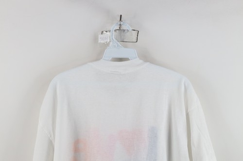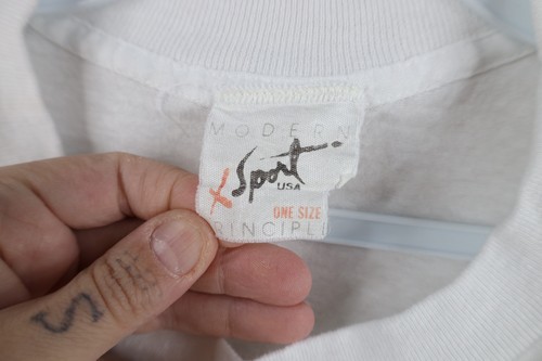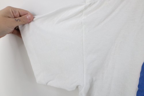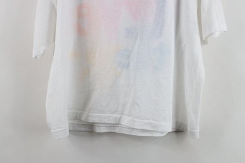 Stains collar, right shoulder. Hole right shoulder. Sheer fabric. Collar, arms discolored. Yellowed. Pilling. Graphics faded. Tag cut. Made in USA