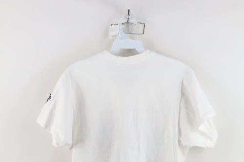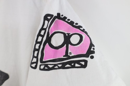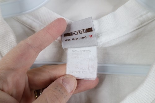 Stains front, blemish on graphics. Collar, arms discolored. Yellowed. Pilling. Graphics cracking, faded. Tag faded. Collar stretched. Made in USA