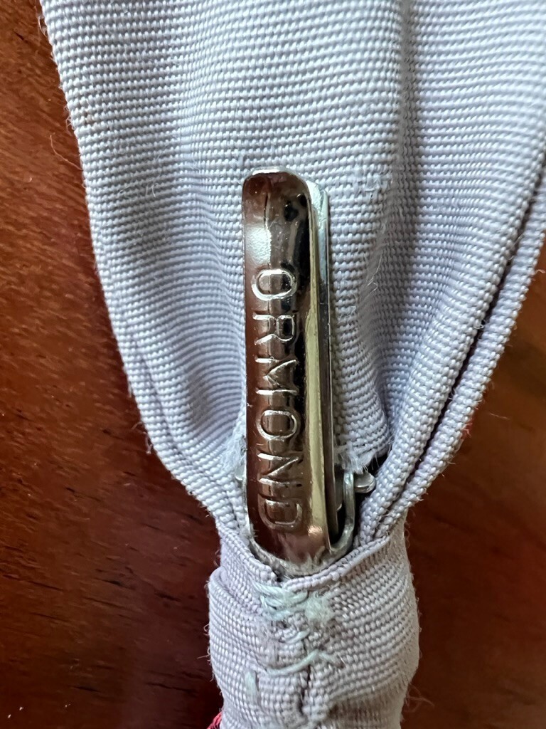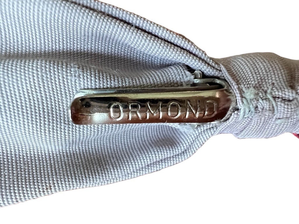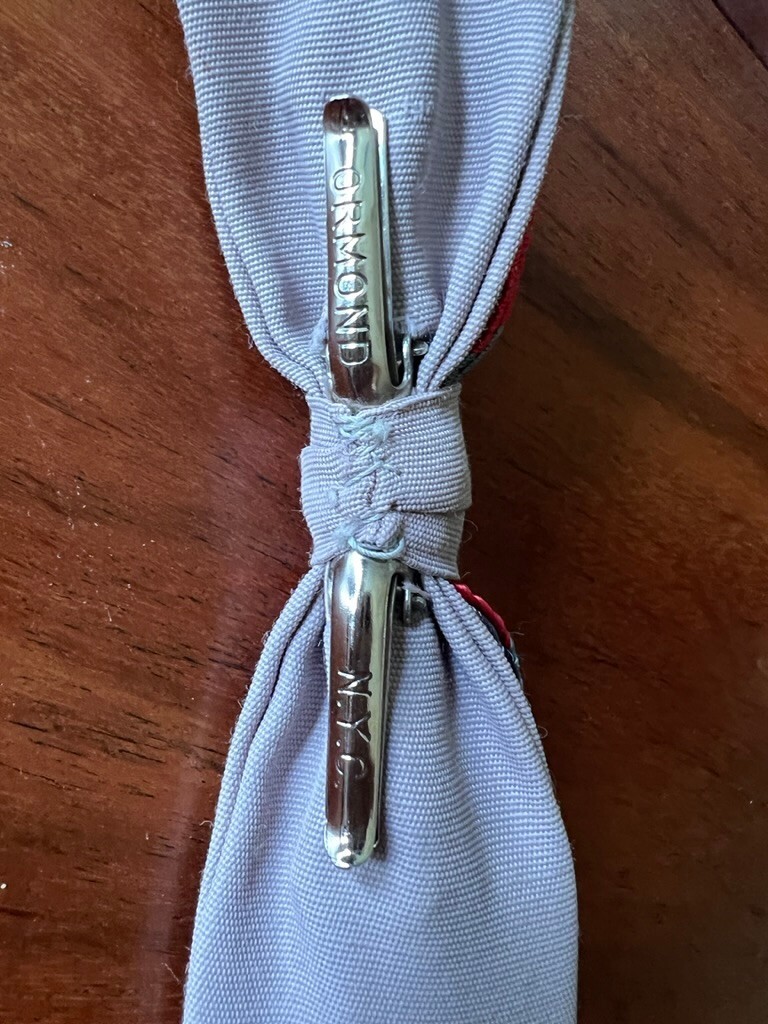 Ormond Mens Bow Tie Red Gray Diamond Pattern Rayon Clip On Vintage 1940s USA. Width is 1.50". Length is 4.75" with a 2.5" metal clip marked Ormond N.Y.C. Good used condition.