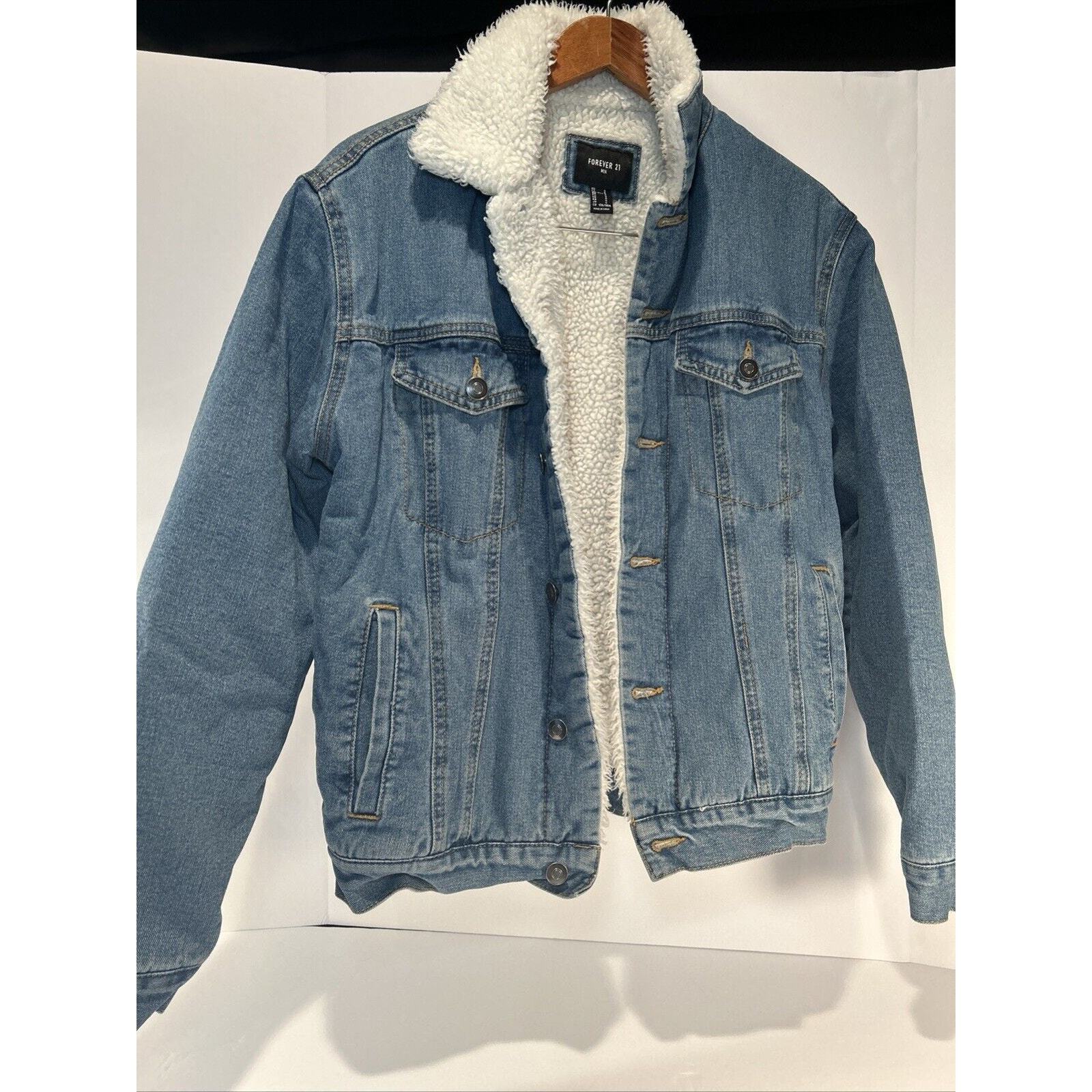 Stay warm and stylish in this Forever 21 women?s sherpa-lined denim trucker jacket, size small. Featuring a soft faux fur lining, this jacket adds vintage-inspired flair while keeping you cozy. Perfect for layering through fall and winter, it?s a versatile staple that pairs effortlessly with casual fits.