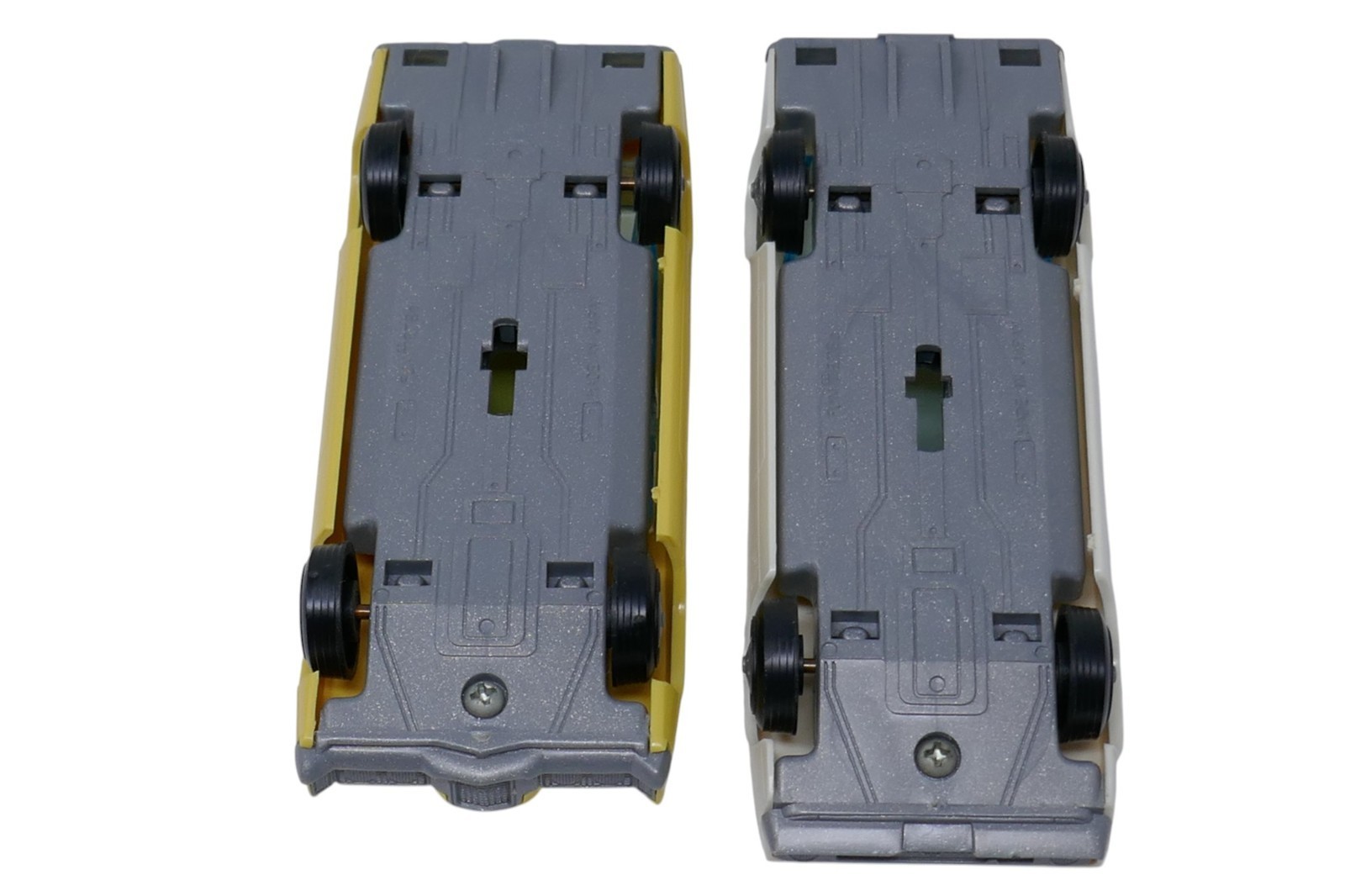 The Proctor Gamble 1970s Funmate Go Cars measure approx. 5" long with minimal wear. This lot features a white Ford Mustang Mach 1 and yellow Mercury Montego GT.