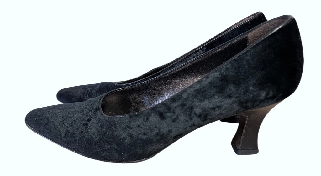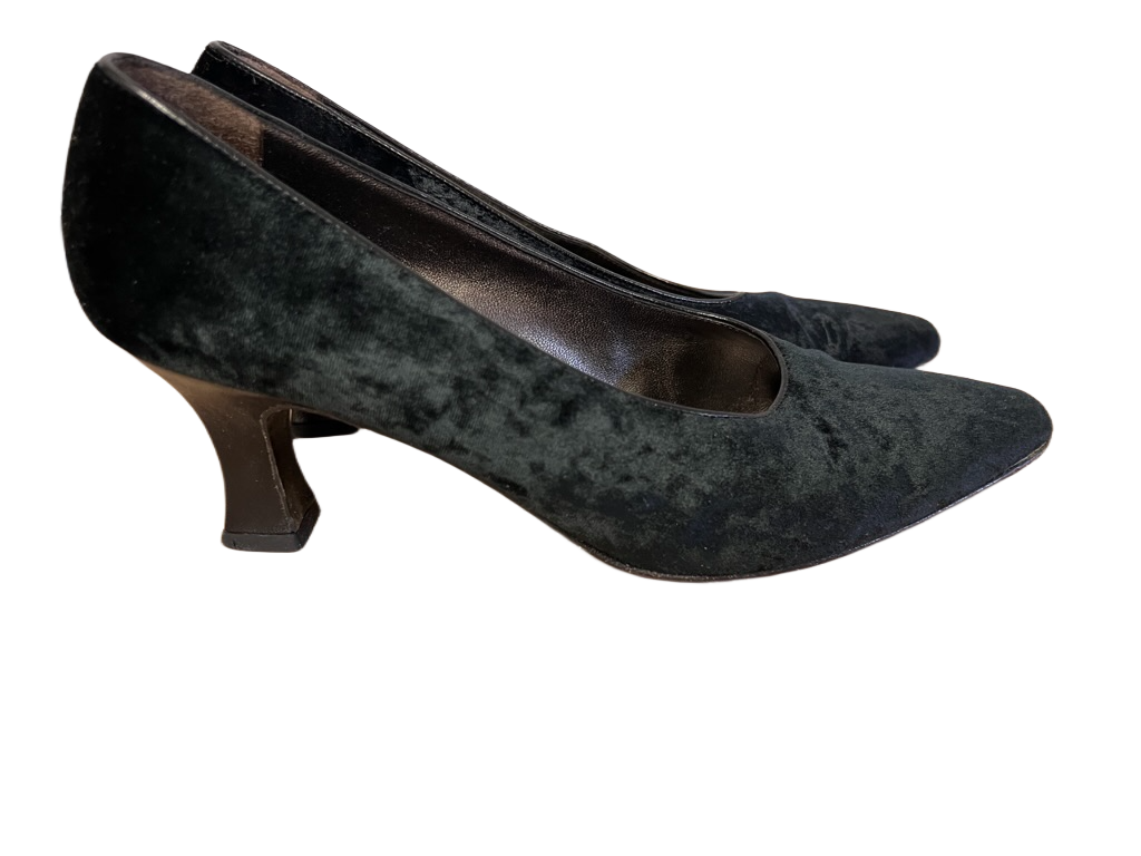Salvatore Ferragamo Vintage Leather Velvet Black 7B 38 80s Excellent W/Box- barely any wear- soles show almost no wear. Leather-wrapped Louis heels aren't chipped or anything. The velvet feels like a type of fur. Beautiful condition, with 2.5" heel. Original box included.