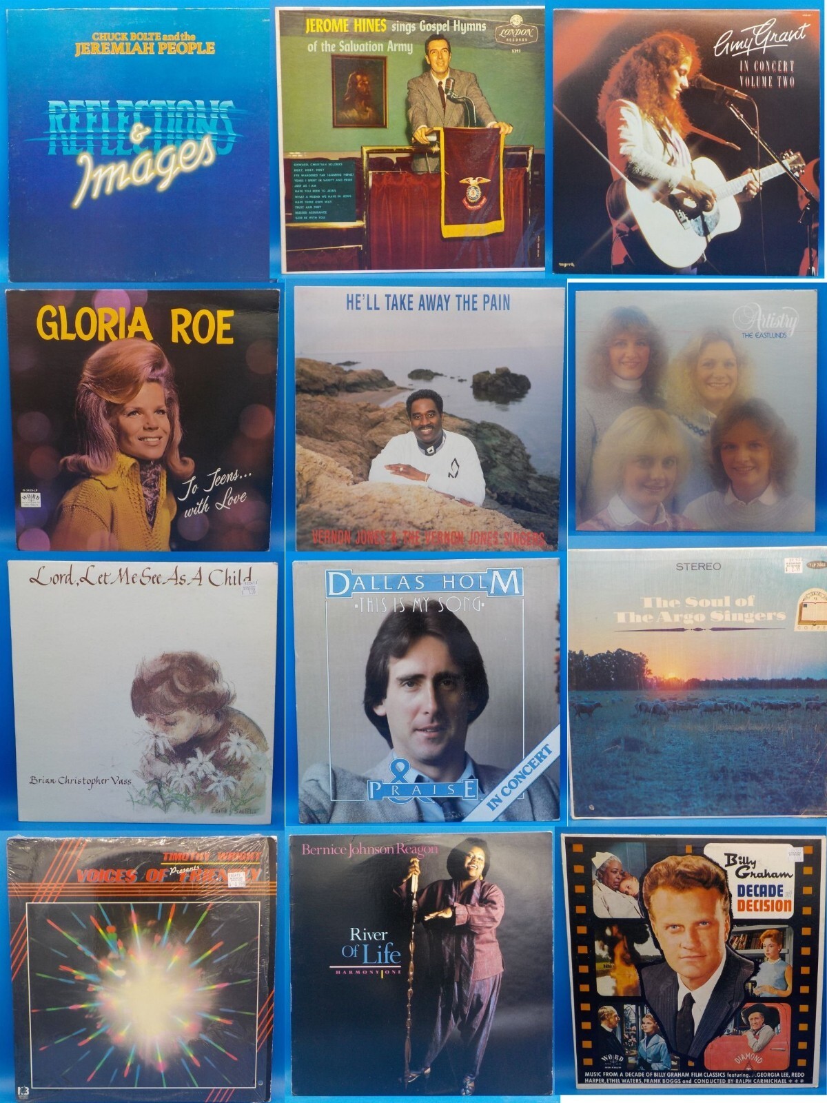 Artists that may be included; Amy Grant, Jeremiah People, King Family, Argo Singers, Dallas Holm, Billy Graham, Jean Redpath, Marji Stevens, Philip Green, Marisa Di Mara, Kings Keynotes, Mahalia Jackson, Bill Pearce, Jesus Lives Forever, Living Water, The Eastlunds, Vernon Jones, Jerome Hines, Tennessee Ernie Ford, Timothy Wright, Terry Talbot, Selah, Jimmy Swaggart, Pat Boone, Abraham Kaplan, Servants Of Light, Spiritborne, Russell Holmes Davis, Truth, Rhena Vaughns, Sheldon Cohen, Squire, Church of The Living God, Eugene and Esther Fiddler, Followers of Christ, etc, etc...