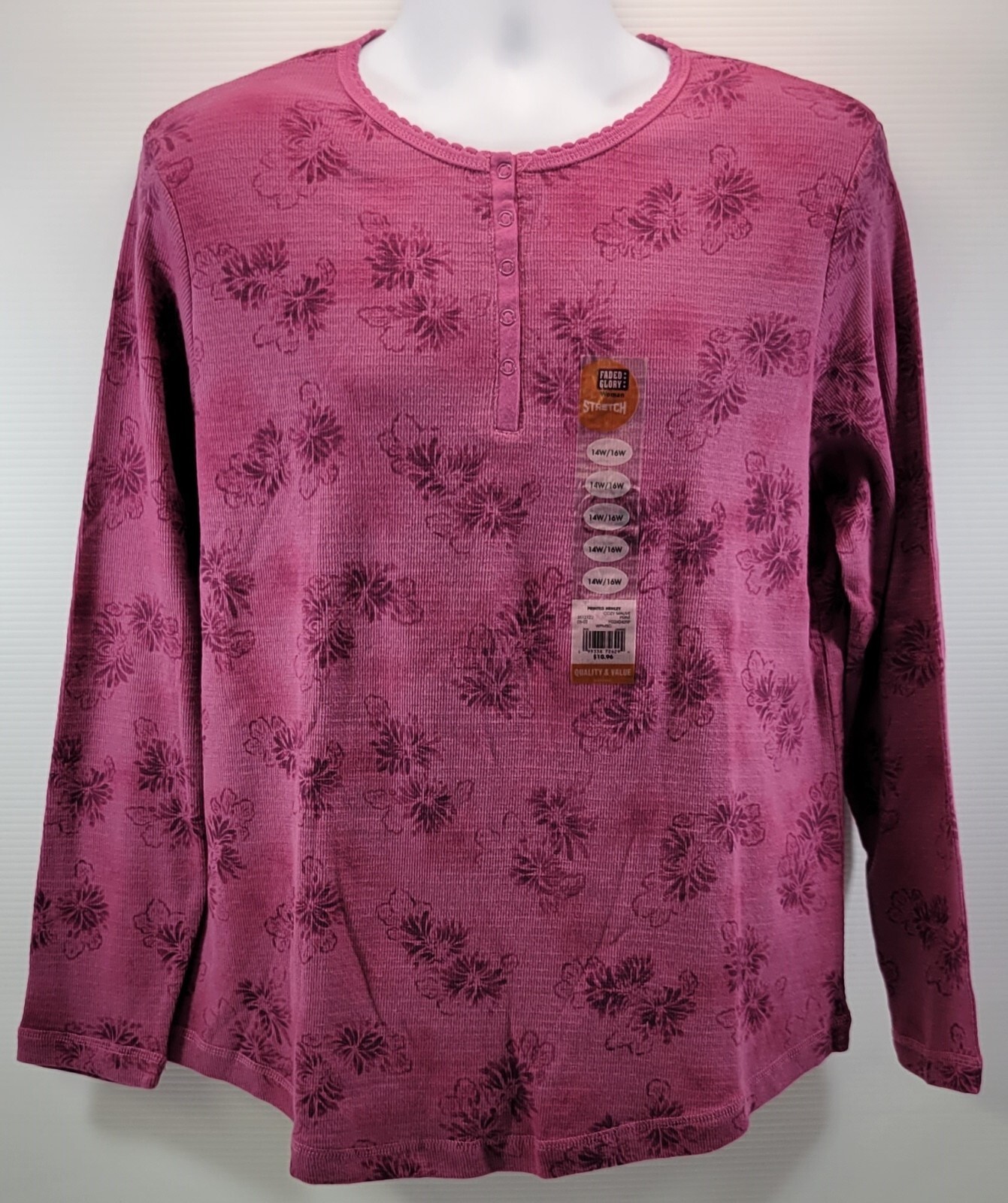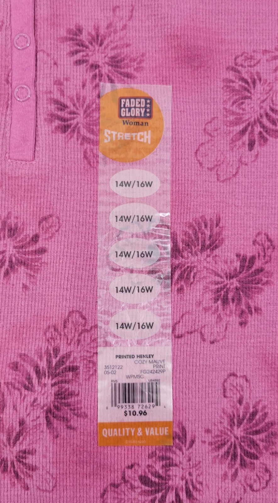 L) Faded Glory Woman Stretch Printed Henley Cozy Malve 14W/16W