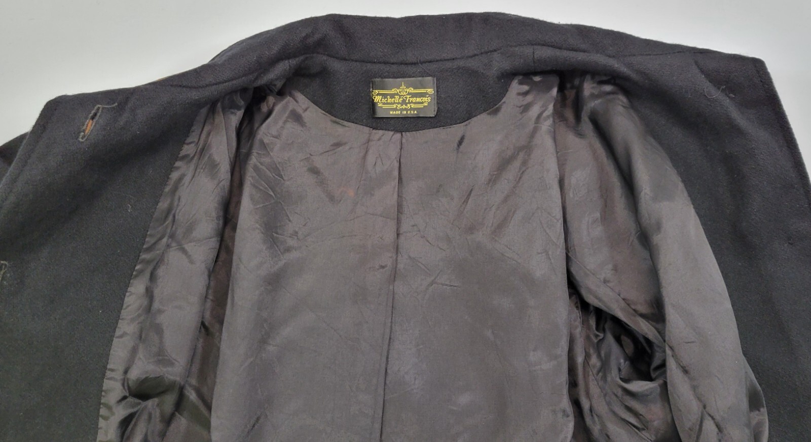N) Vintage Michelle Francois Women Black Wool Coat Suede Shoulders USA