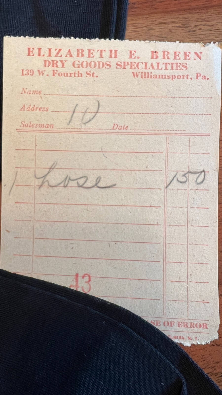 new ,unused, Purchased from and includes the sales slip, Elizabeth E. Breen Dry Goods Specialties, 139 4th St, Williamsport PA. Amazing!