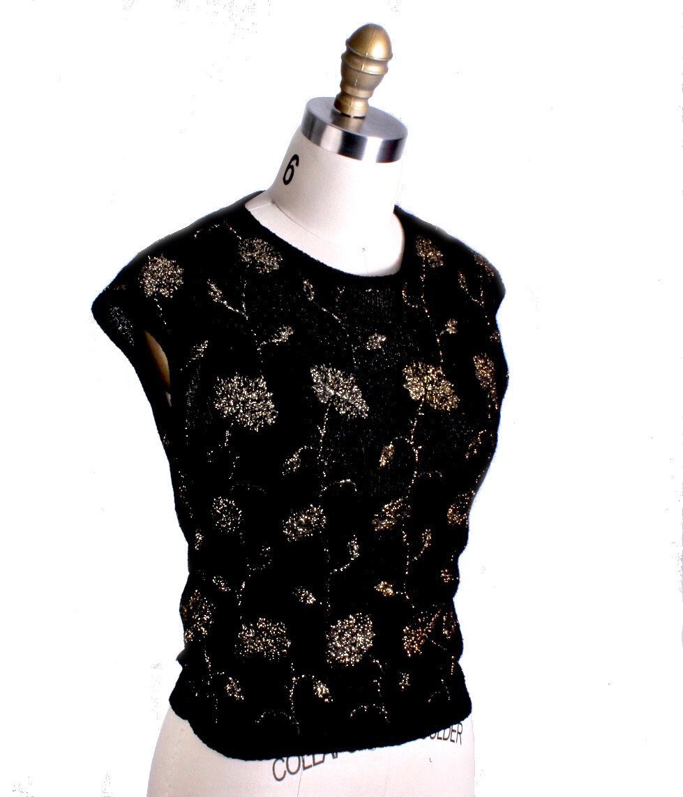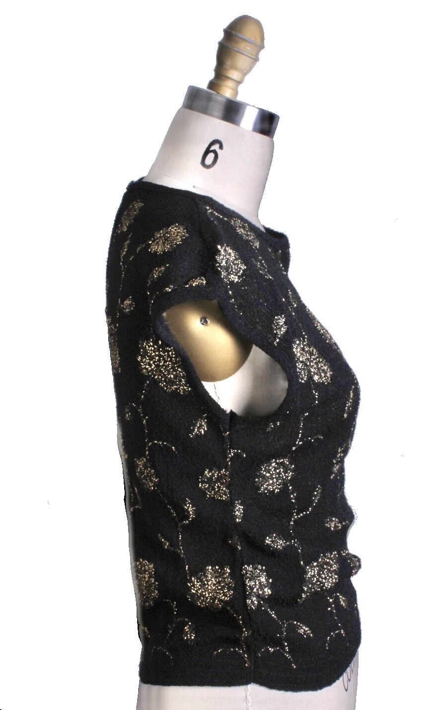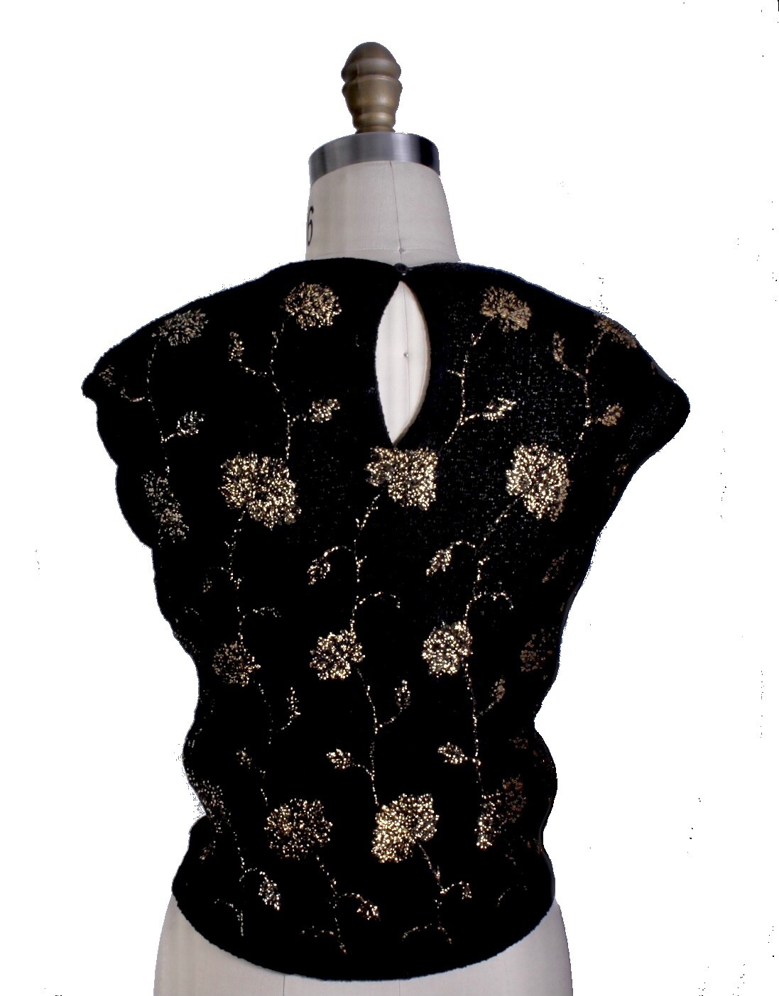 VTG Black/ Gold Floral Metallic Rayon Boucle Shell Tank Knit "Stylebest" Womens S is in perfect, clean shape. The gold is sparkly, which I can't seem to show in the photo. Closes in back with a button. Imagine with a little black pencil skirt.