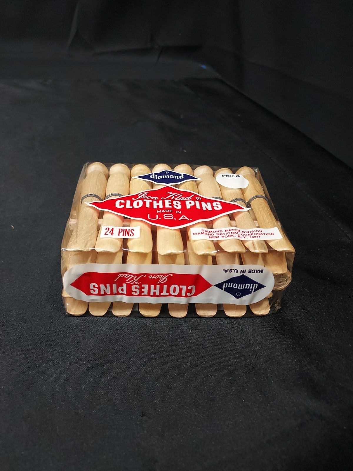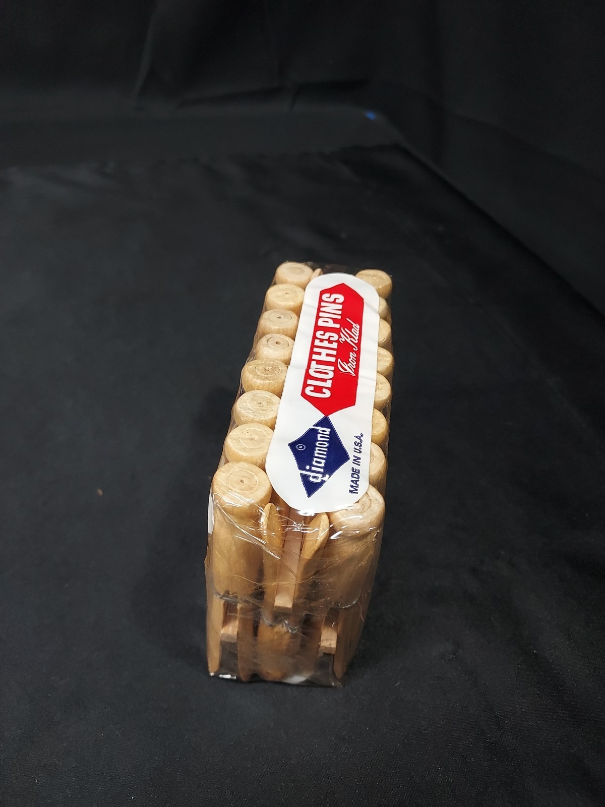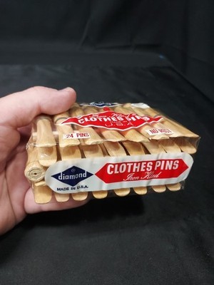 NOS Vintage Diamond Wooden Round Laundry Clothespins Clothes Pins USA 24 Pack. Condition is New. Shipped with USPS Ground Advantage.