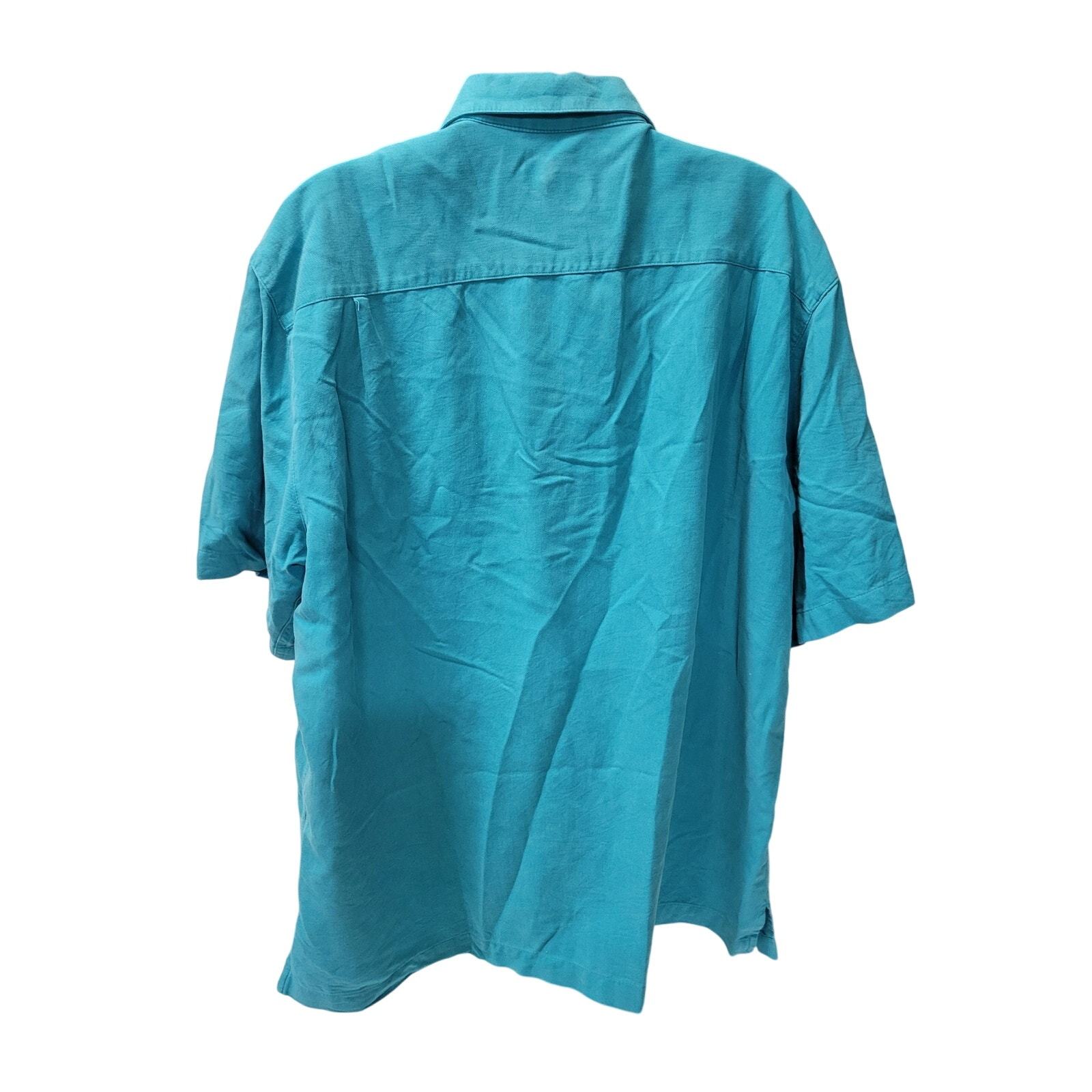 Caribbean Joe Men Large Hawaiian Cotton Silk Shirt Short sleeve blue teal button