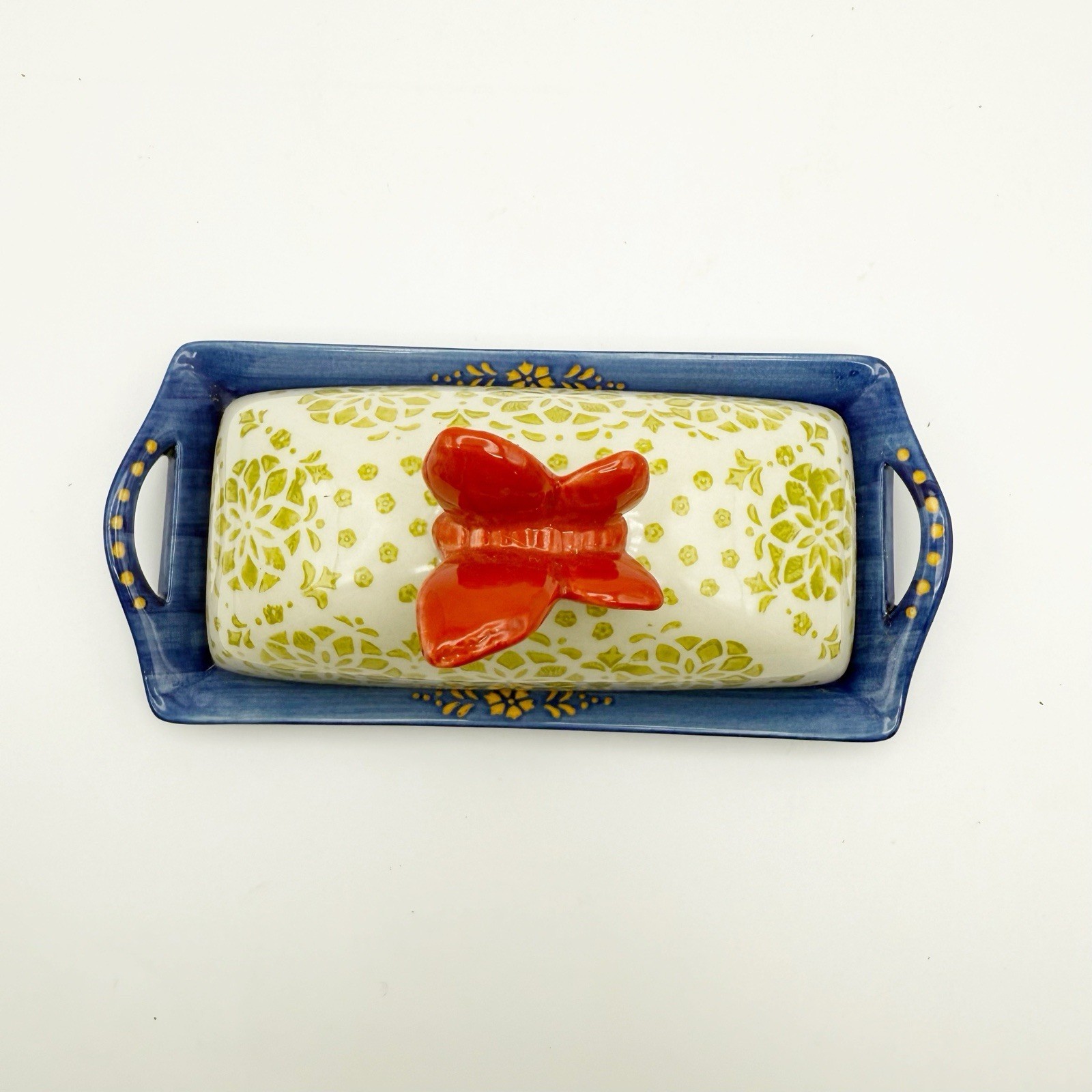 Pier 1 One Hand Painted Butter Dish Stoneware Blue Dish Red Butterfly with Lid