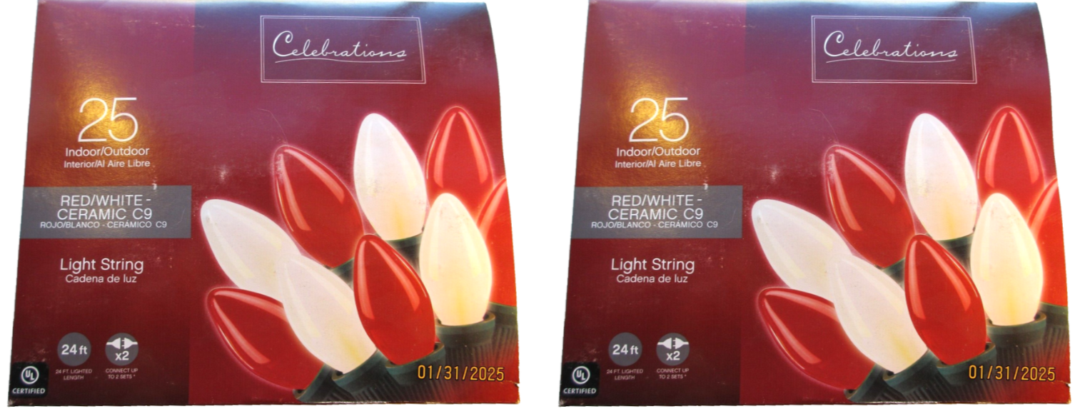 Christmas String Lights Incandescent C9 25ct 24' ft Red/White, Celebrations C4BG4N11 (2-PACK)
