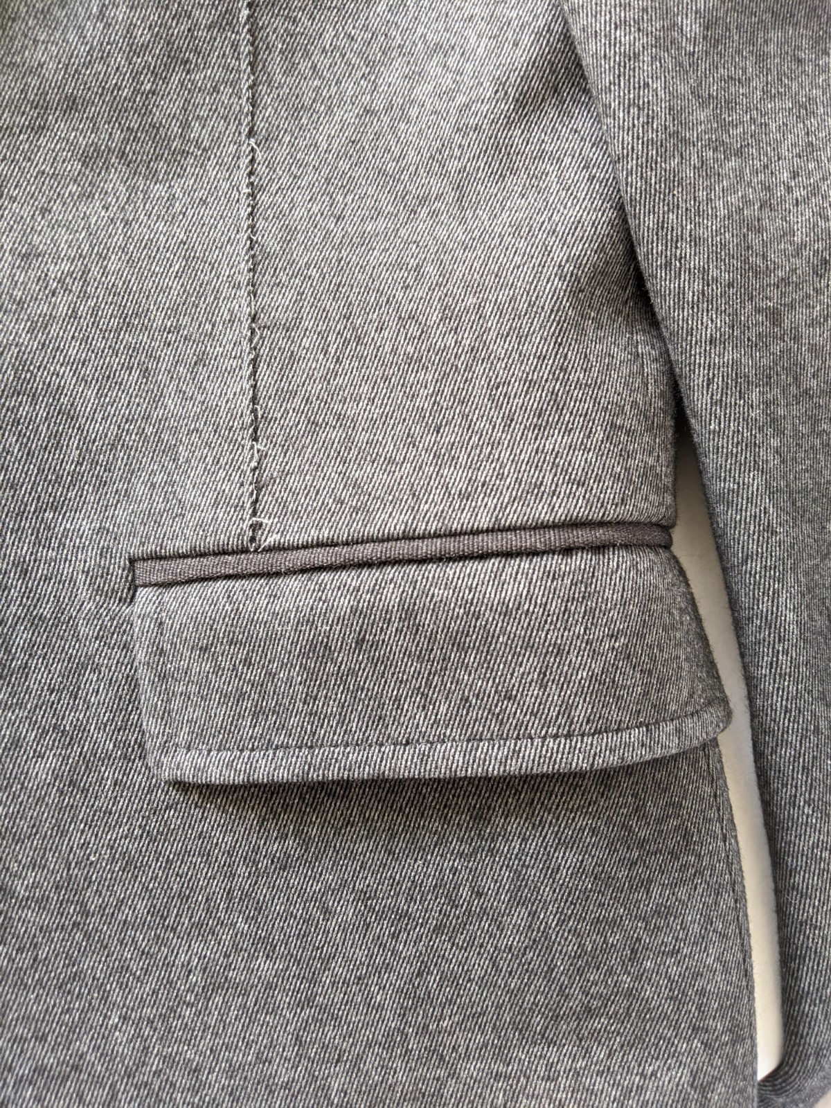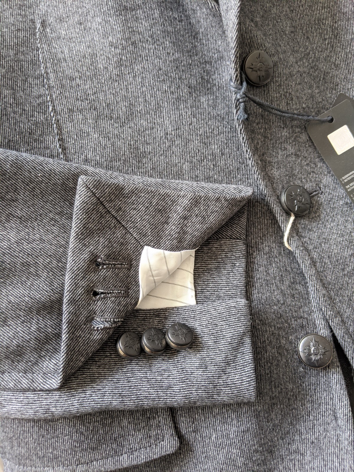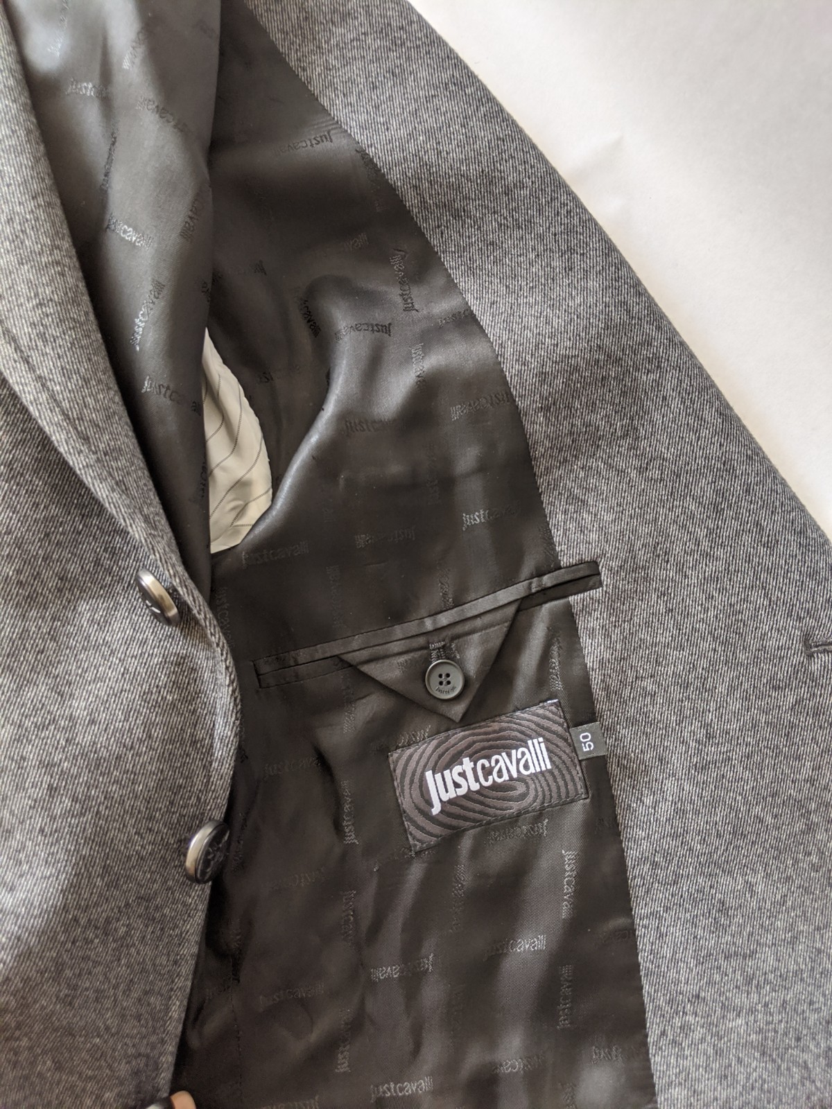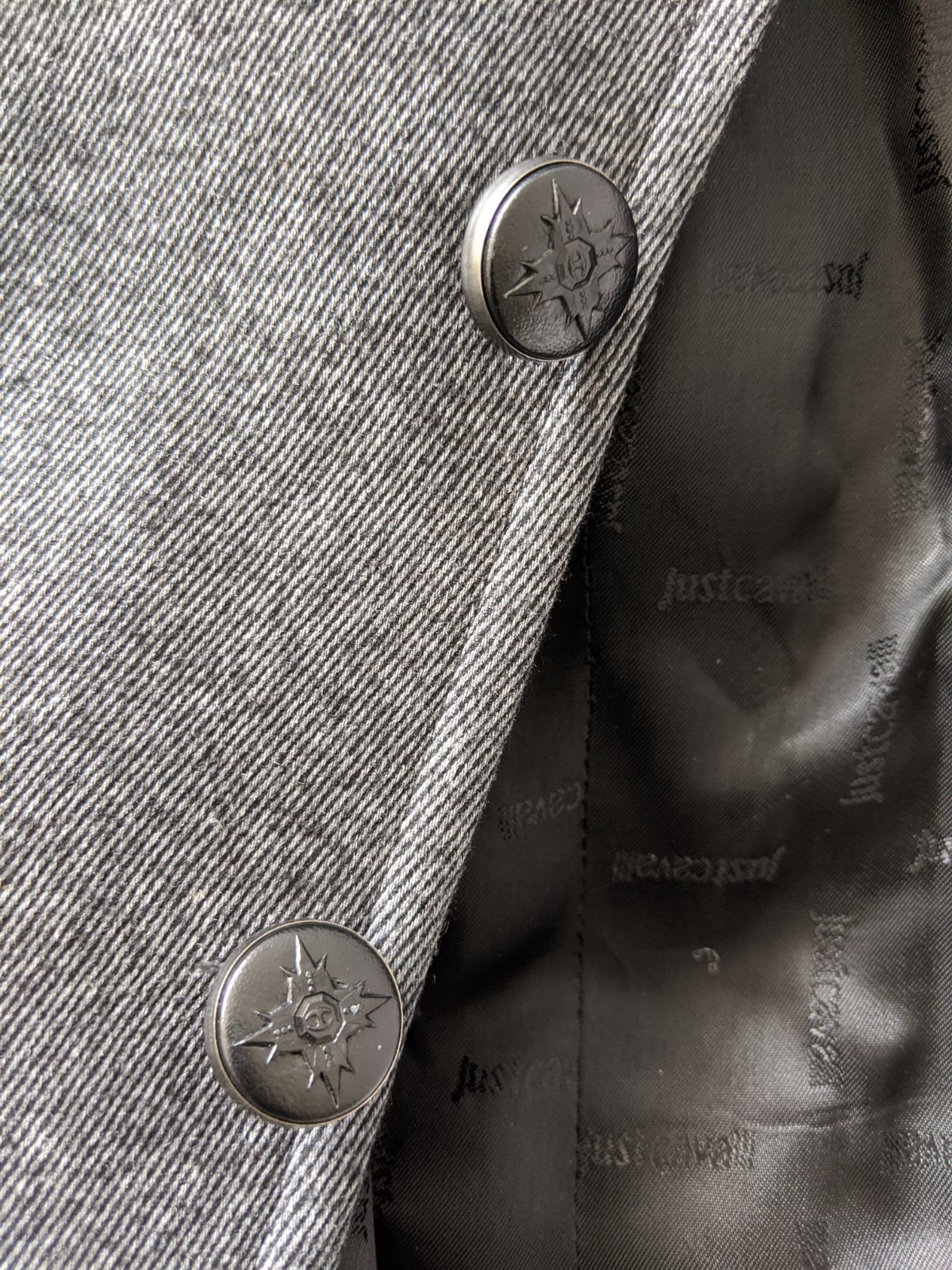 Just Cavalli Men's Gray Twill 3 Button Blazer in size IT 50. *Top button left undone in model photos. Gray twill cotton/wool/poly blend with a bit of cashmere. Features a single back vent, raw front darts, contrast welt trimmed hip flap pockets, outer breast pocket, inner breast pockets on left and right sides, fully functional cuff plackets, and embossed buttons. Includes spare buttons (1 large, 1 small) inside inner breast pocket. Garment measurements are Bust: 43", Waist: 38", Center back neck to shoulder: 9.75", Sleeve length: 27", Back nape to hem length: 29". Fabric composition: 40% cotton, 37% wool, 20% polyester, 3% cashmere. Body lining: 50% acetate, 50% viscose. Sleeve lining: 100% viscose.