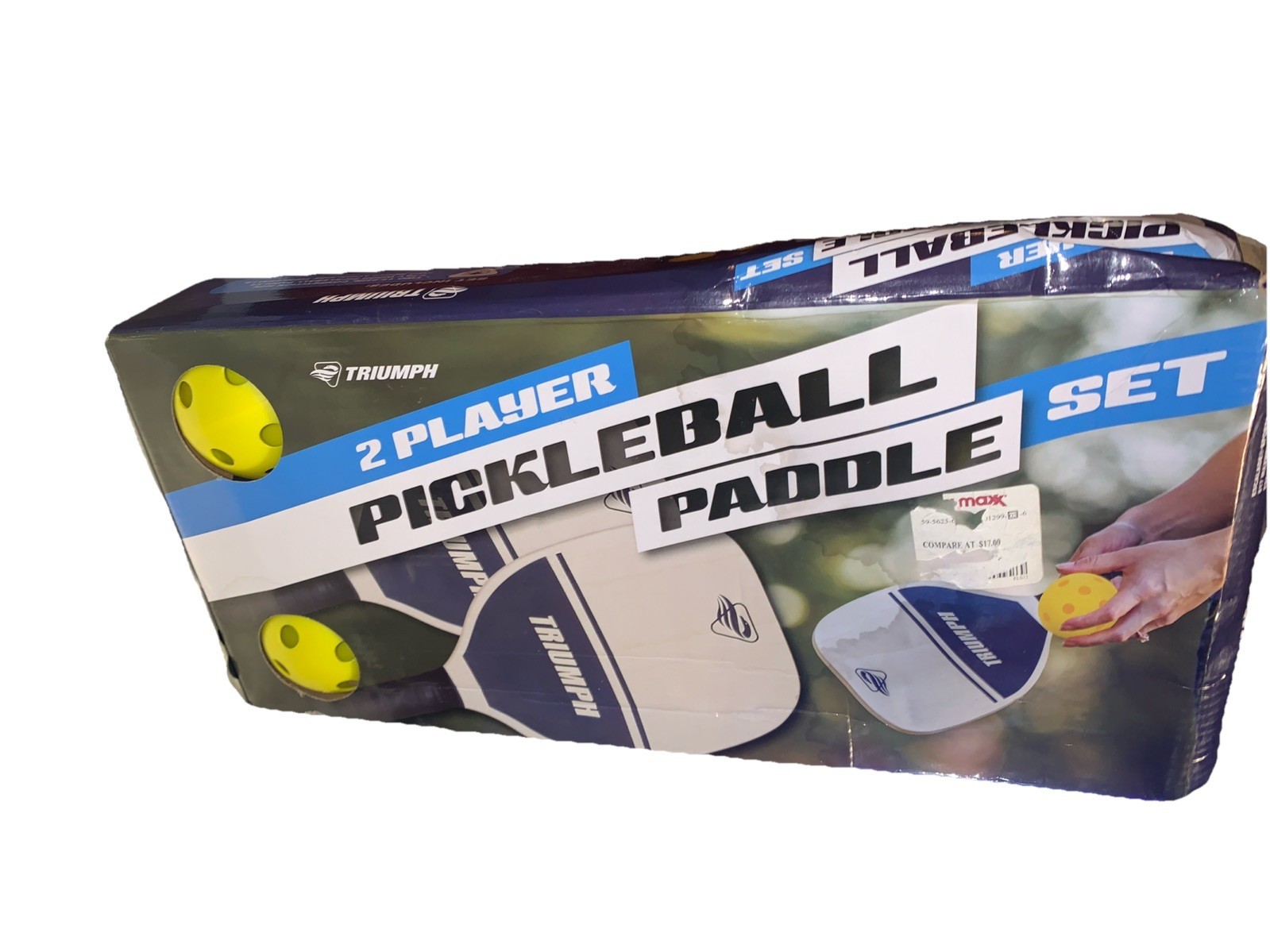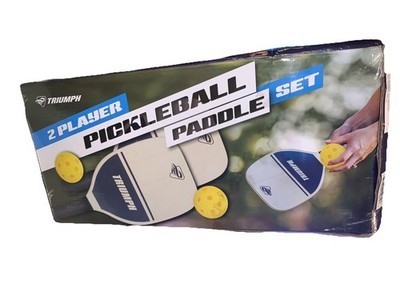 The Triumph Pickleball Set includes 2 paddles and 2 balls, perfect for outdoor fun and games. This 2-player set is brand new in the box, making it a nice gift for sports enthusiasts. Made in China by Triumph, this set features high-quality materials and construction for a durable and enjoyable playing experience on the court. Whether you're a beginner or a seasoned player, this set provides everything you need to enjoy a game of picklesball.