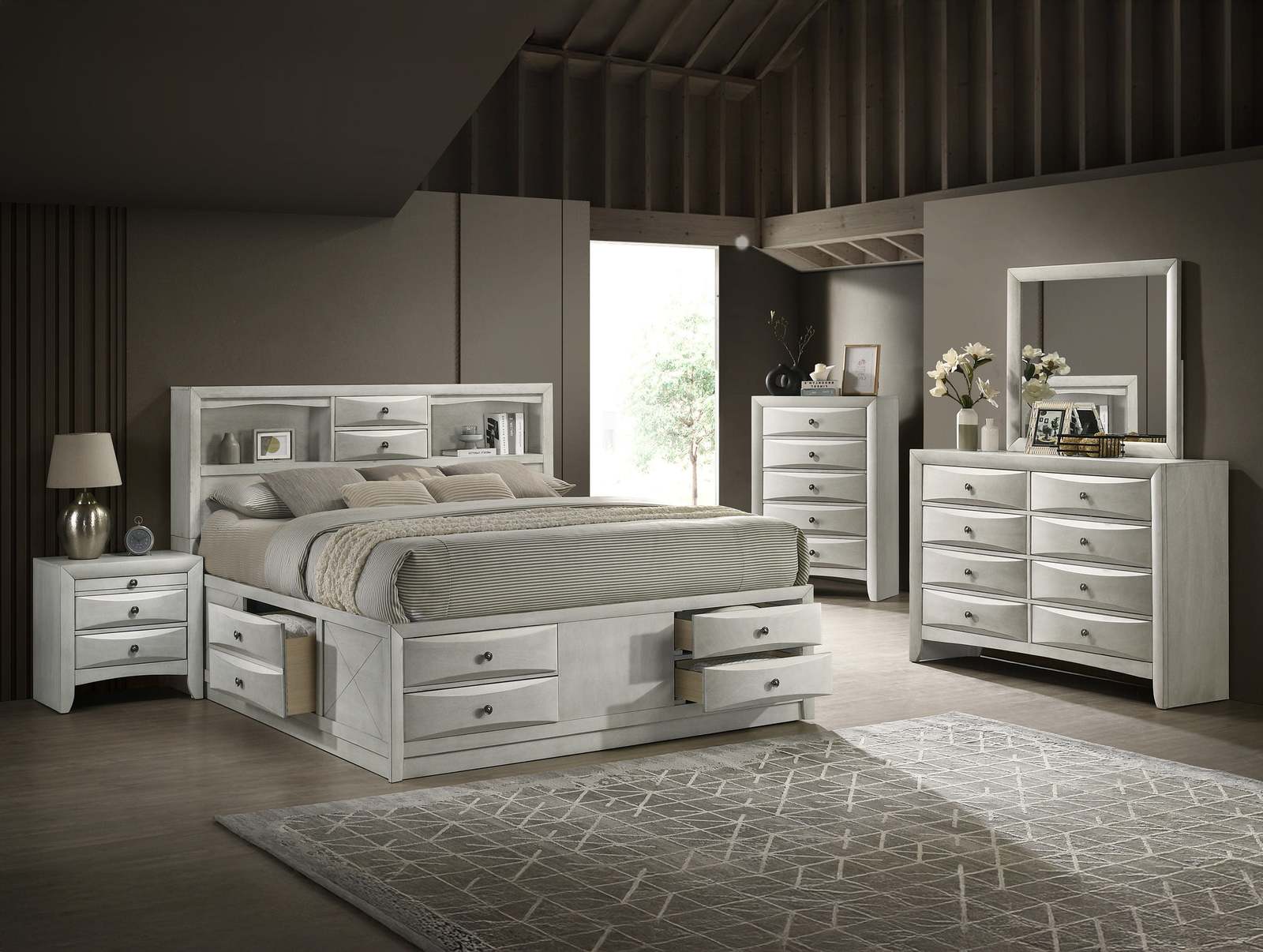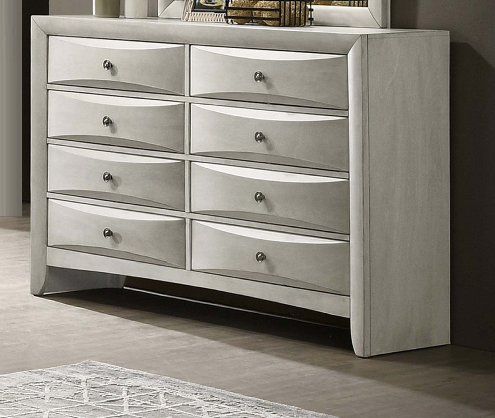 Description: Complementary pieces offer a streamlined design, curved drawer fronts, and ample storage to keep your space tidy and elegant. Finished in a chic, neutral white, this group transforms your bedroom into a harmonious retreat with smart design and contemporary charm.