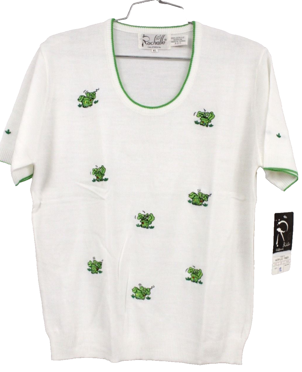 Adorable 1970s Rochelle ladies sweater in soft white acrylic, decorated with green embroidered turtles on their backs across the front. Ribbed knit waistband. New with tags.