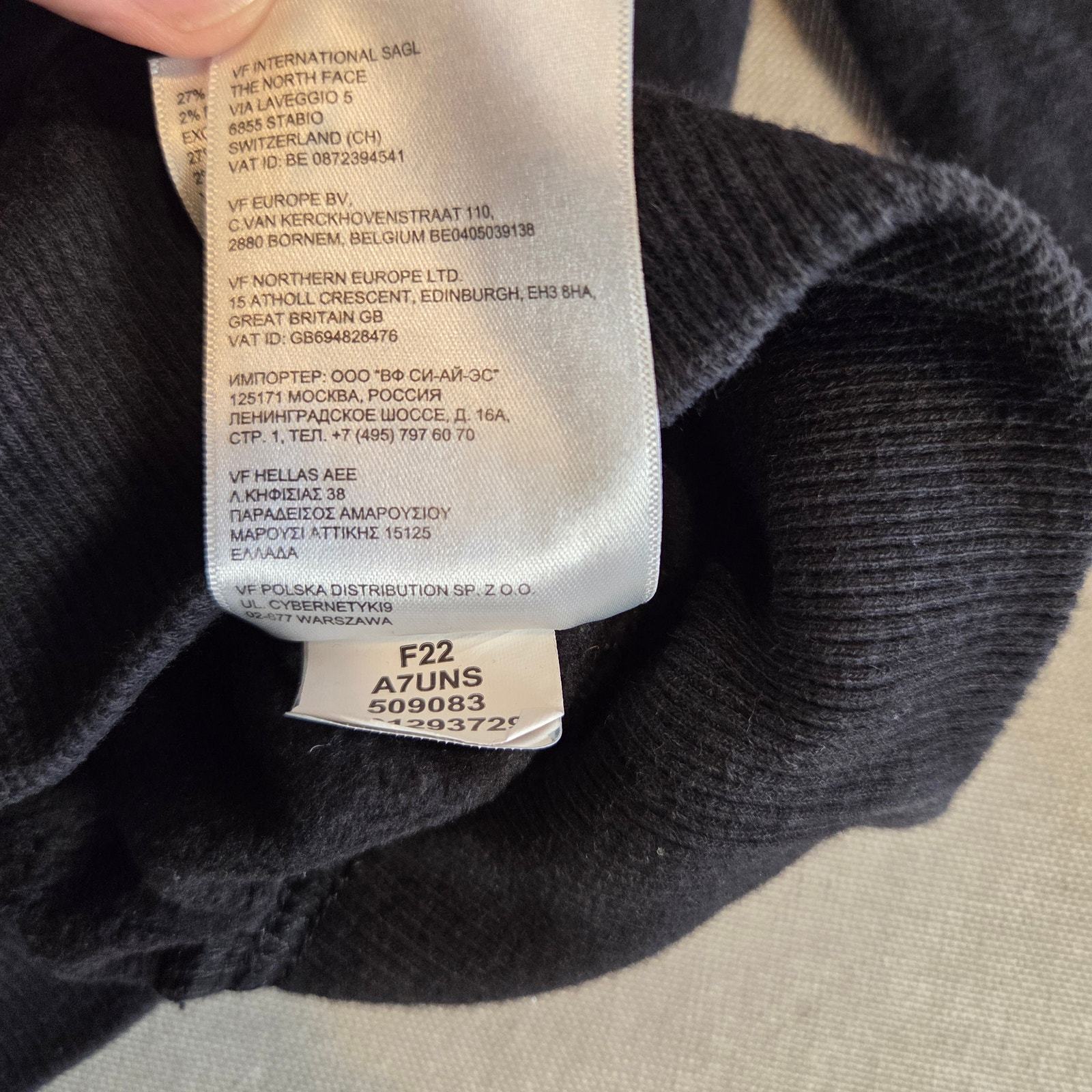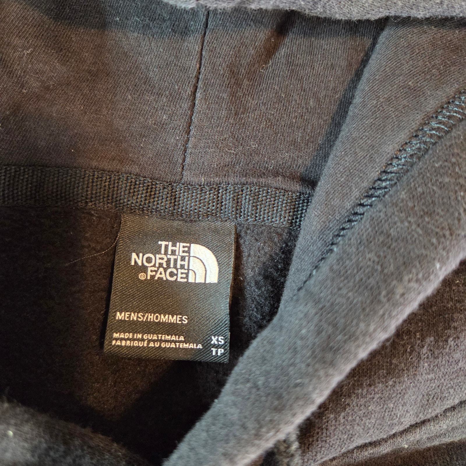 This is a men?s The North Face hoodie in size XS, black cotton-blend fabric with front chest logo and large back logo. It features a drawstring hood and kangaroo pocket. Tag reads F22, indicating Fall 2022 release.