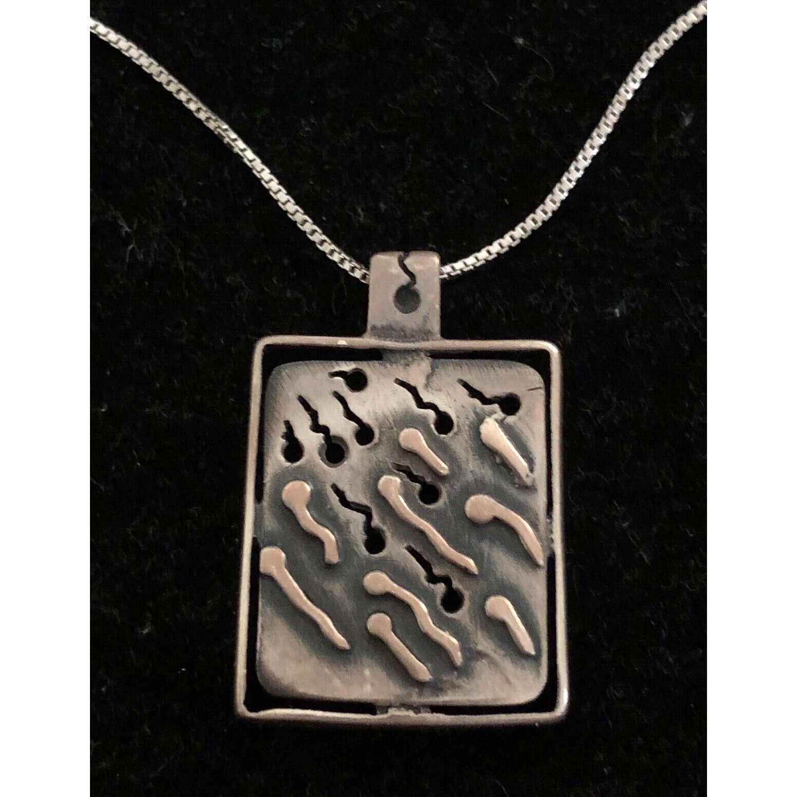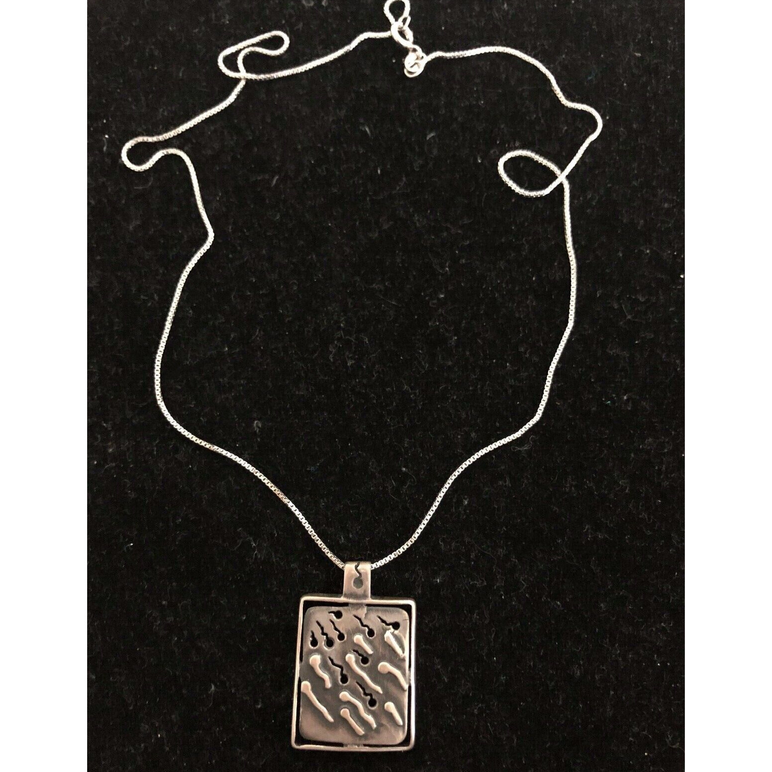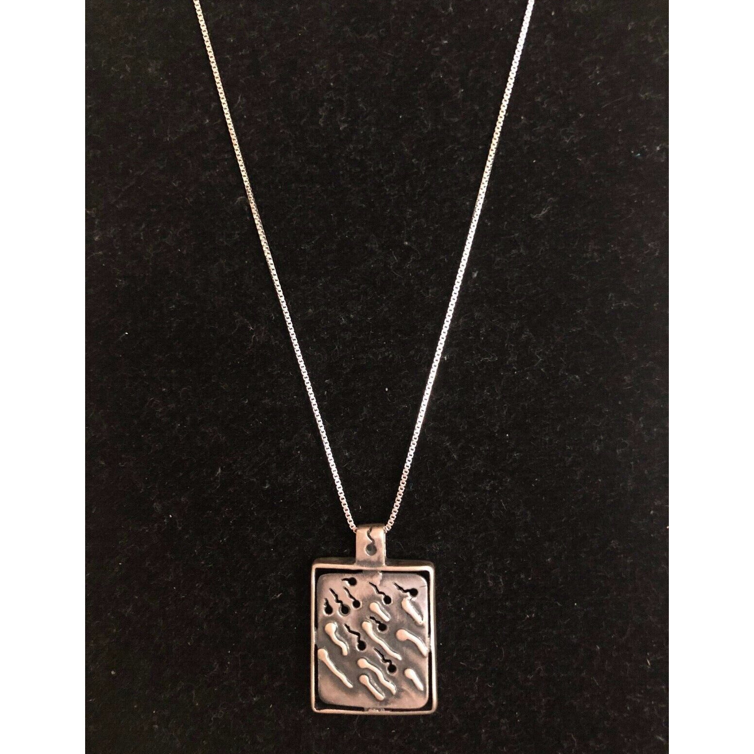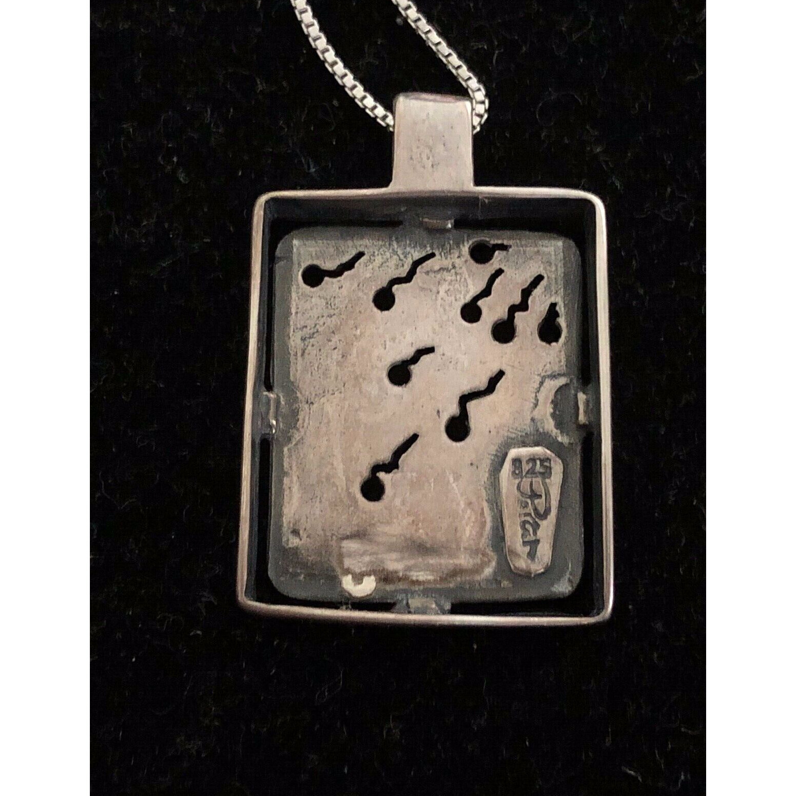 SIZE:APPROX.3/4/ x 1 1/2".CUT AND EMBOSSED DESIGN WITH GOLD ACCENTS.COMES WITH ITALIAN STERLING SILVER APPROX.17 1/2" LONG BOX CHAIN.