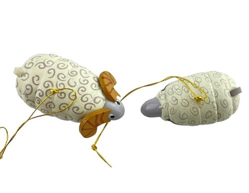 Set of 2 fluffy sheep white with gold curliques in random pattern. Hangs on a gold cord. Adorable tree ornaments add a festive touch to your Christmas holiday decor
