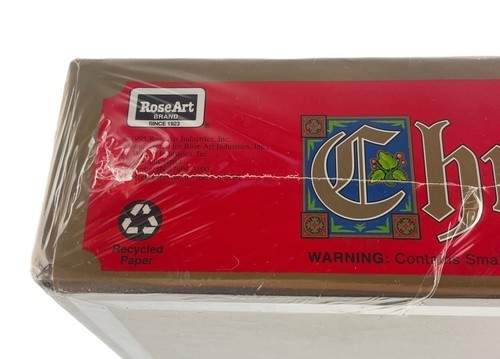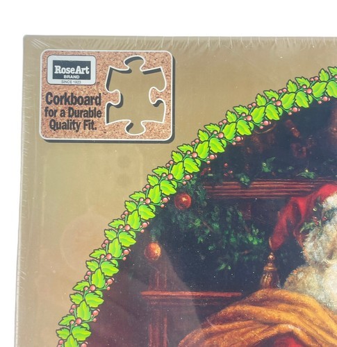Get into the holiday spirit with this beautiful 500 piece jigsaw puzzle by Rose Art. The puzzle features a festive Christmas theme with jolly Santa filling Christmas stockings hanging on the fireplace mantle. The puzzle is made from high quality corkboard material and is sealed in its original packaging from the 90s.