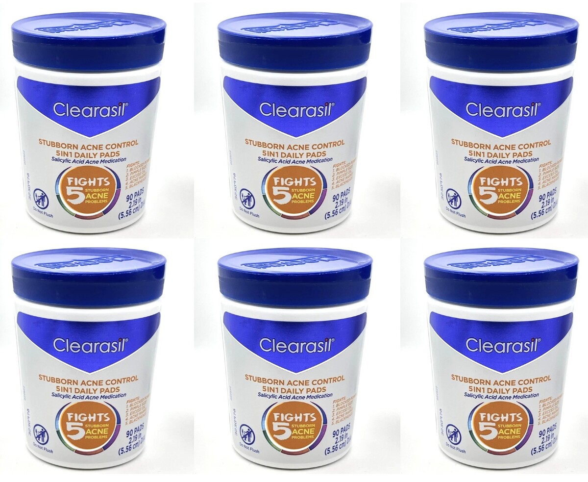 ( Lot of 6 ) Clearasil 5 in 1 Daily Cleansing Pads Stubborn Acne Control 90-Count/Pack