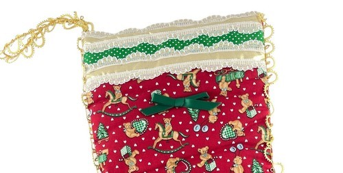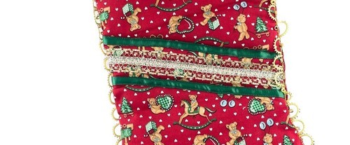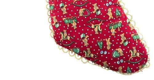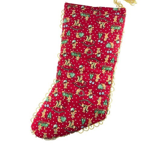 Christmas Stocking Victorian Style Red with Teddy Bear Pattern Gold Trim