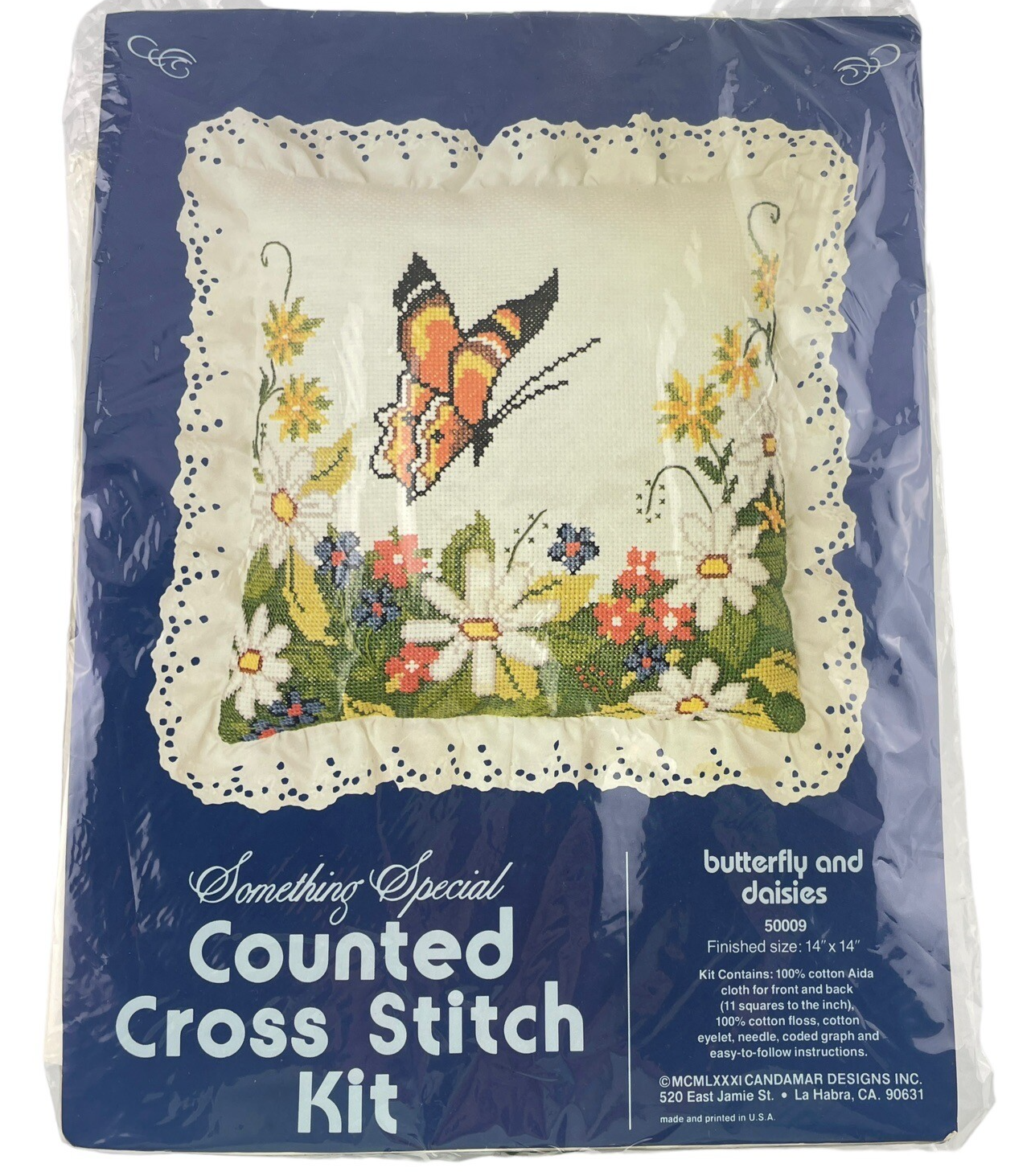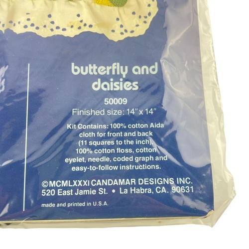 Candamar Counted Cross Stitch Pillow Butterfly and Daisies 14x14" Vintage 80s