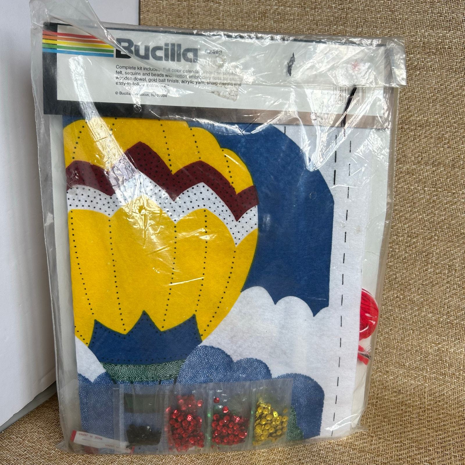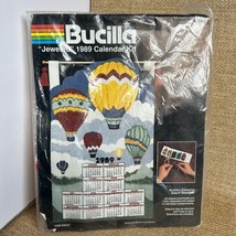 Vintage Bucilla ?Jeweled? 1989 Calendar Kit, new in original sealed package. Features a colorful hot air balloon design with Bucilla?s signature sequin sparkle effect. Complete kit includes printed fabric, sequins, beads, thread, and instructions.