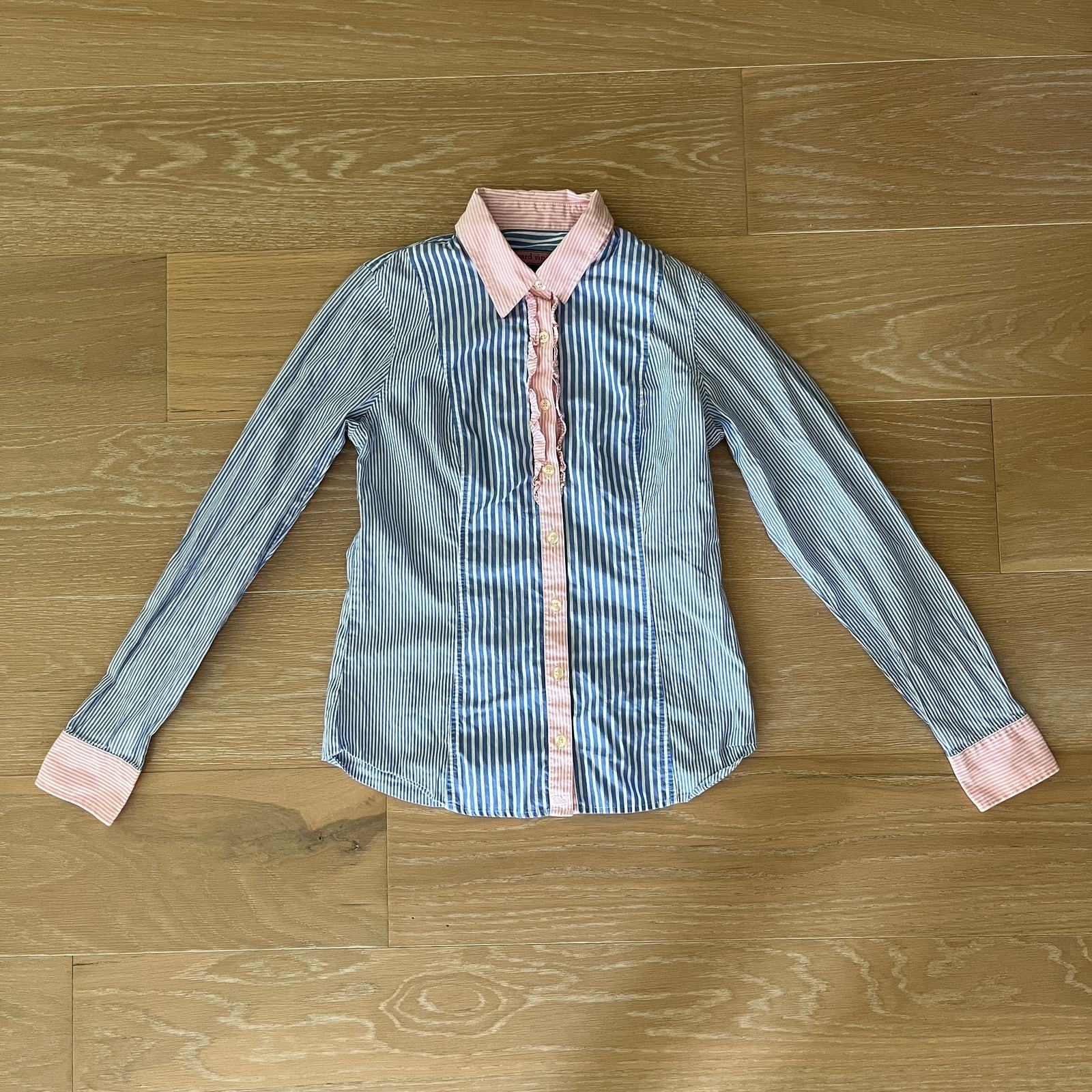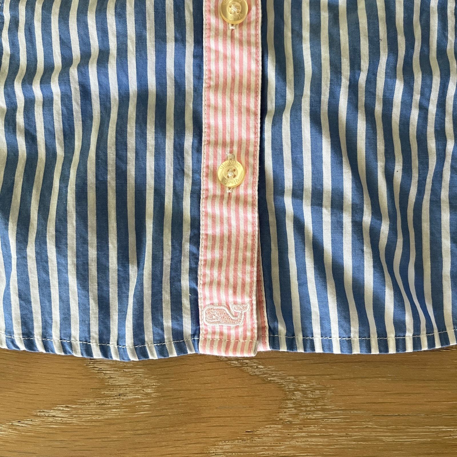 Vineyard Vines Blue and White Stripe Shirt with pink trim and ruffle detailing.