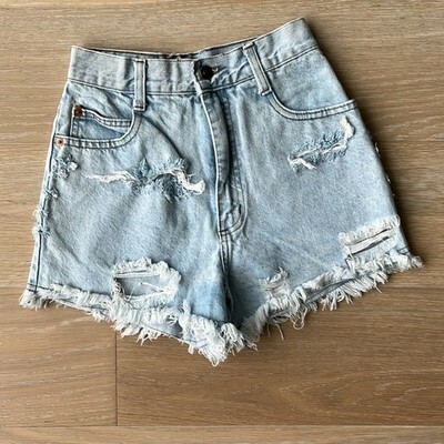 STEEL vintage distressed, high-rise denim jean shorts. Great, preowned condition. The pockets have been cut and are non-functional. 100% cotton denim - no stretch.