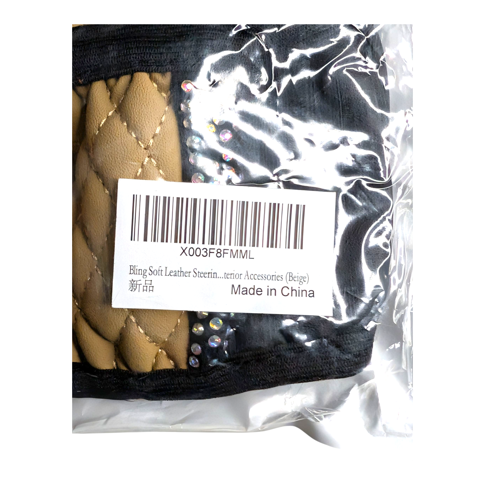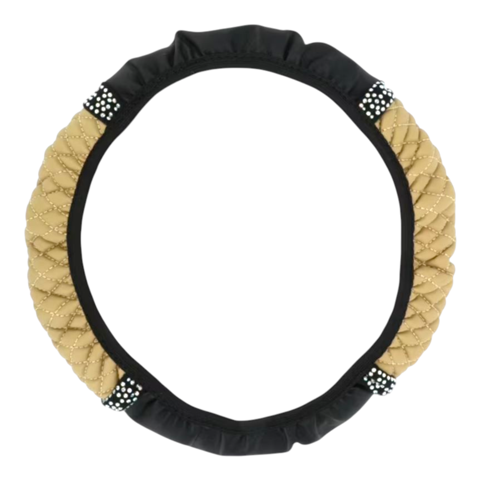 Black Beige Faux Leather Bling Rhinestone Steering Wheel Cover 14.6"-15" New