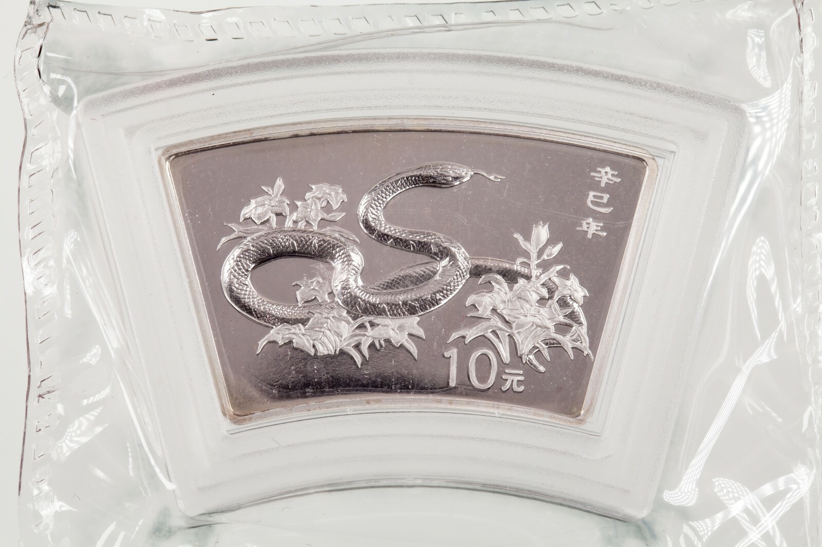 Include CoA, che recita: La moneta d'argento commemorativa dell'anno del serpente 2001 ha corso legale della Repubblica popolare cinese, emessa dalla Banca popolare cinese, coniata da Shanghai Mint e distribuita esclusivamente da China Gold Coin Incorporation. Il dritto raffigura il titolo della Repubblica Popolare Cinese, la data dell'anno e la porta-torre Chenghai Lou della Grande Muraglia. Il rovescio presenta un serpente e il valore nominale. E una moneta d'argento a forma di ventaglio da 30 gradi, finezza del 99,9%, 10 yuan di valore nominale e contiene 1 oncia di argento puro. La tiratura totale e di 66.000 pezzi. Questo per certificare che la moneta e Bu, in termini di qualita ed e all'altezza degli standard per quanto riguarda finezza e peso.