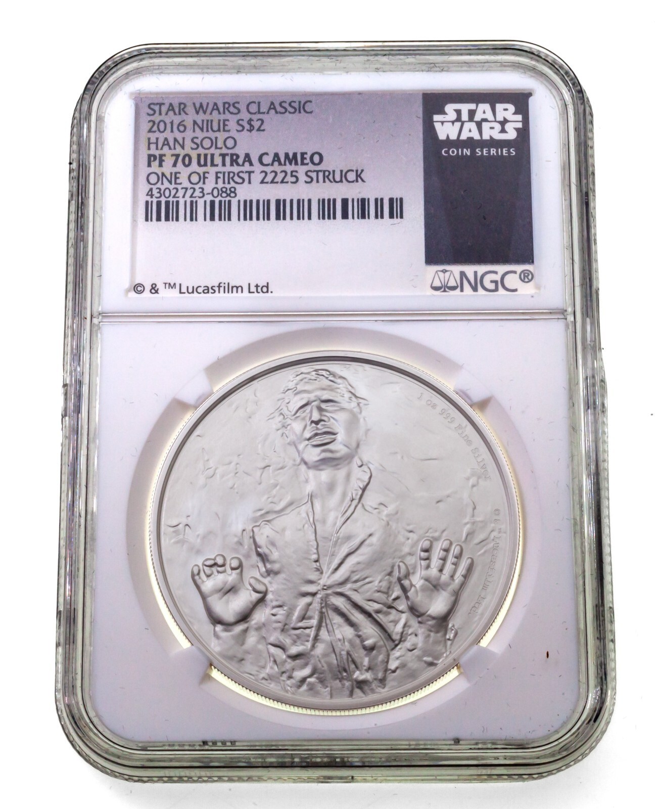 2016 Niue S $ 2 Star Wars Classico Han Assolo NGC PF70 Ultra Cammeo Box COA