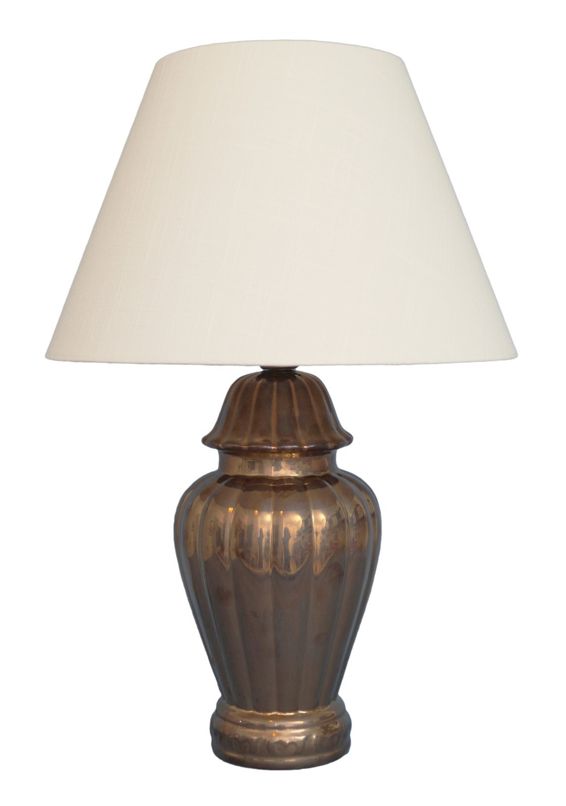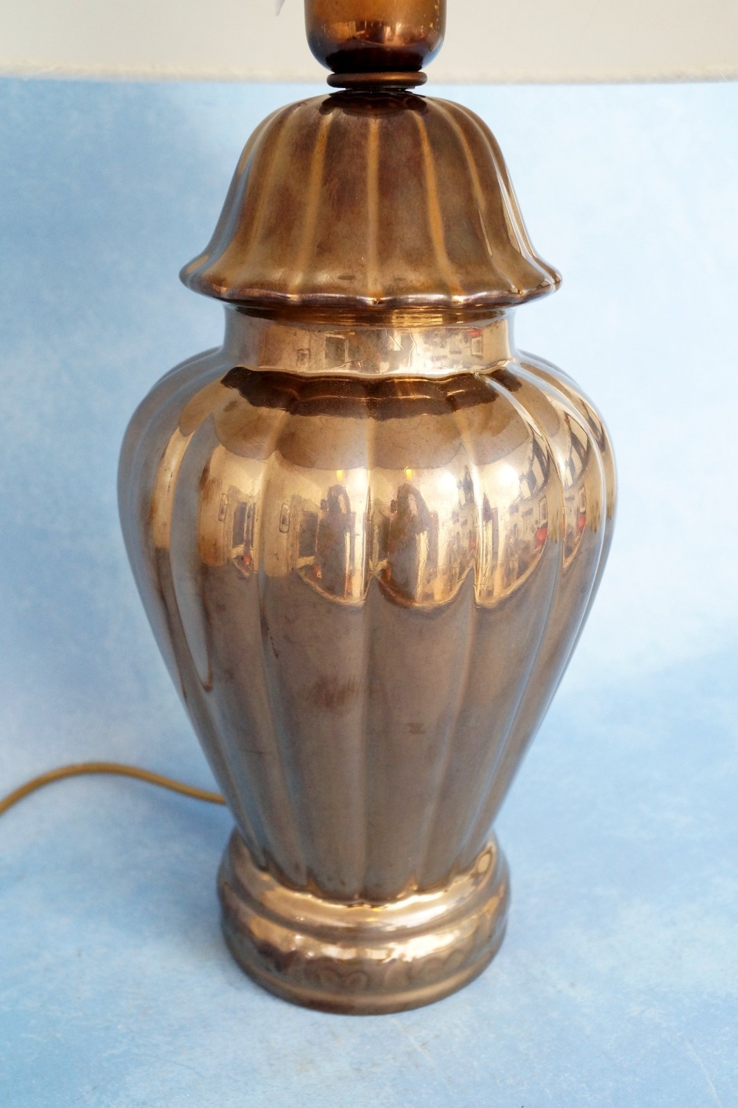 Beautiful Art Nouveau/Art Deco amphora -lamp.ETWA 1970s. High -quality ceramic foot - measurement from the outside - very noble! Total height 55 cm, shield diameter 37 cm. NEW cream -colored fabric shade - also to me brown shield, up to 60 watts. Brass-colored PVC supply line with intermediate switch.
