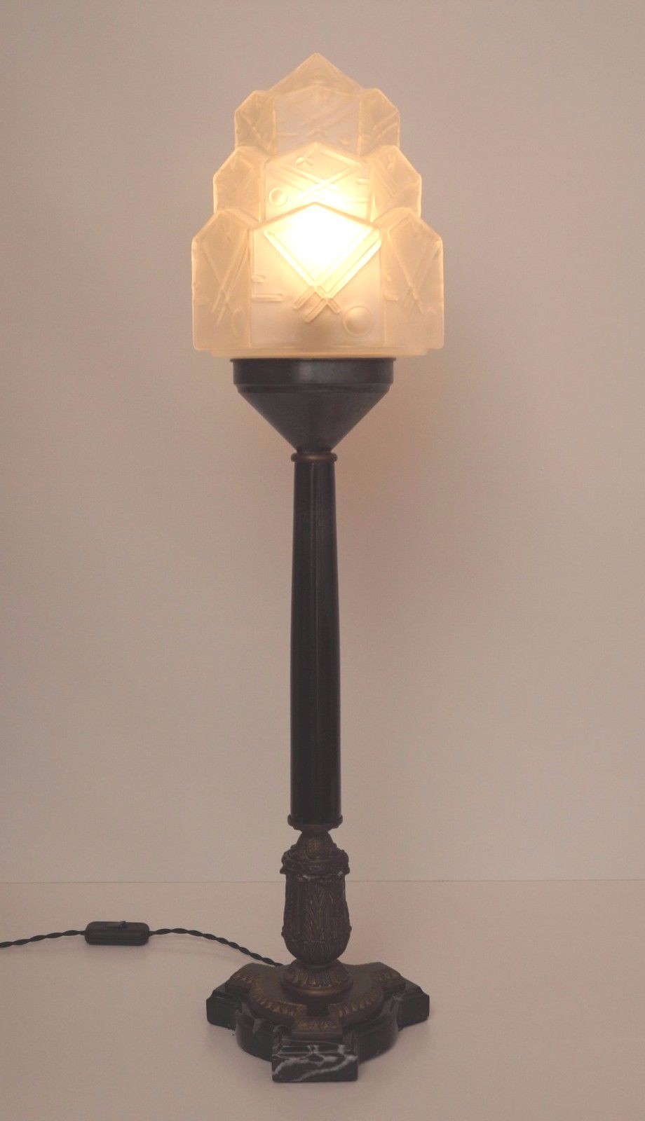 Unique original Art Deco Table Lamp " Chrysler Star" around 1930-1940. Fantastic original marble/bronze gear with a unique patina. Indian original Skyscraper glass, satin. A total height approx. 75 cm, umbrella diameter approx. 20 cm. Complete new electrical installation. Black, twisted textile supply with cord switch. Antiquity E 27 brass version with porcelain clock, up to max. 40 watts. Hundreds of other Art Nouveau lights in our shop!