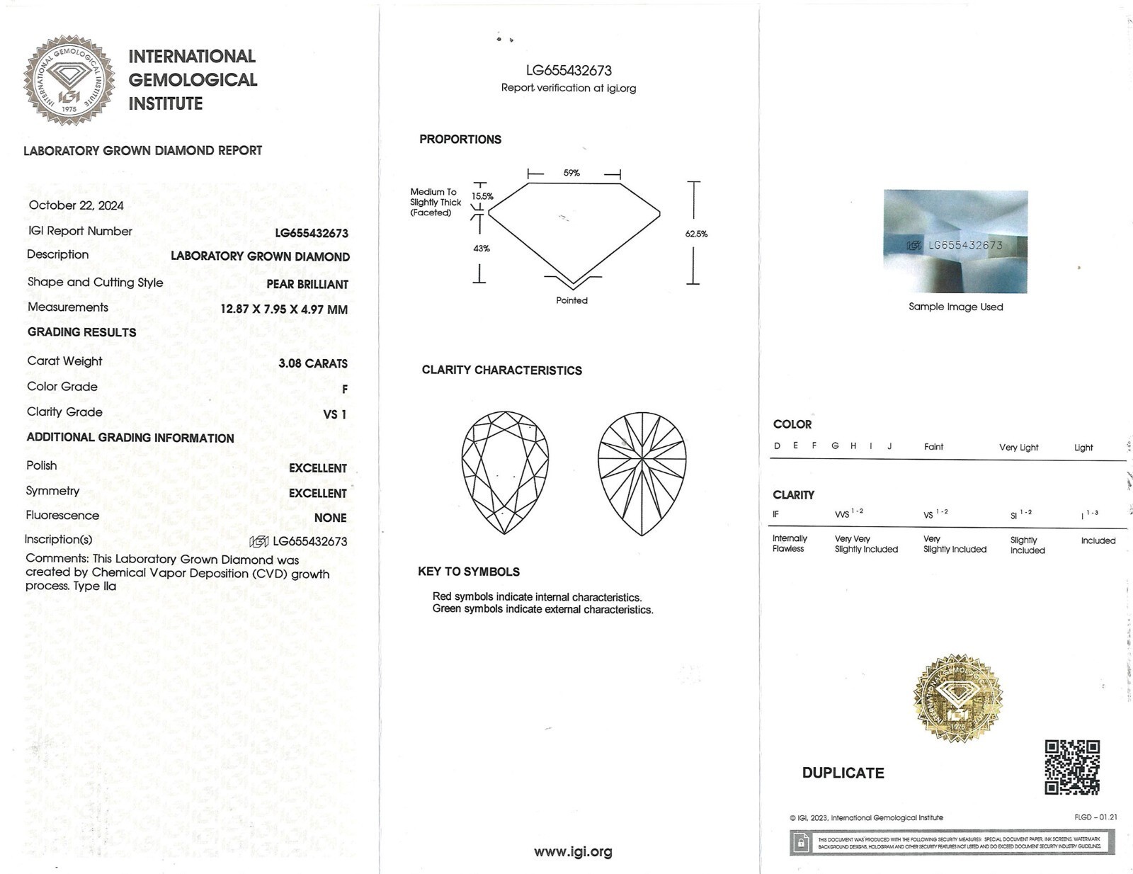 Igi 4.04 TCW (3.08CT) Kunstdiamanten Grown Birne Brillantschliff Diamantring 14k