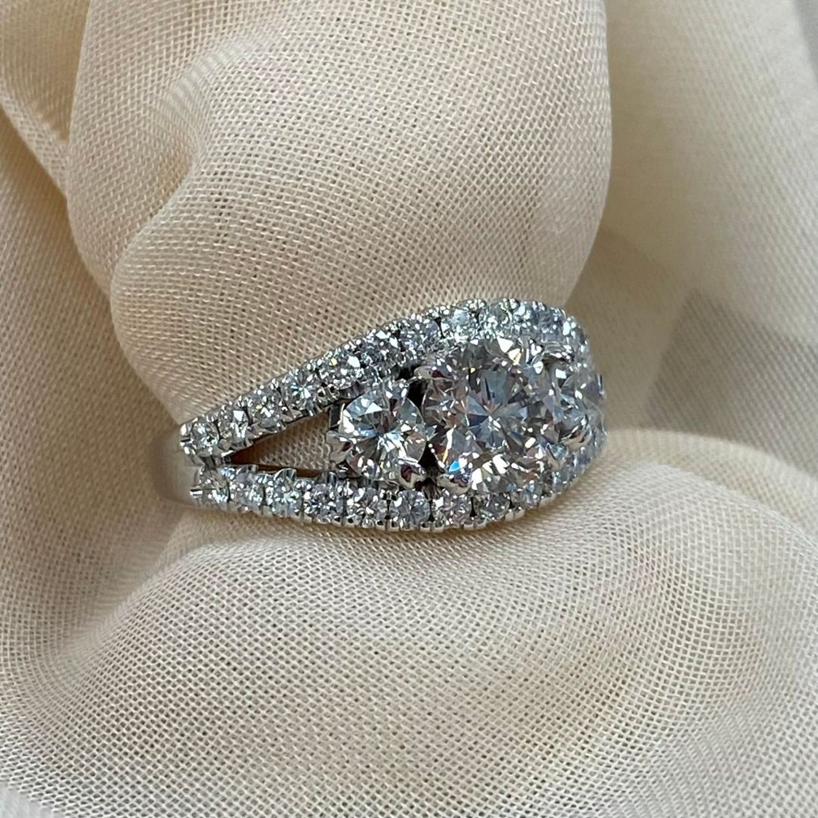 Pasado presente Future anular un símbolo de amor y compromiso de símbolo atemporal. Este sorprendente anillo de compromiso esta cruzado en oro blanco solido de 14k, diseñado para representar el viaje de una pareja juntos a traves de la vida; ¡Los preciados recuerdos del pasado, las alegrías del presente y la promesa del futuro! El elegante anillo de compromiso de diamantes de diseño de tres piedras cuenta con diamantes naturales de corte redondo brillantes en el centro de color marron debil certificado por GIA con un peso de diamante total total de 1.00 quilates con 0.40 quilates 2 diamantes en el lado con 0.70 quilates mas pequeños diamantes de corte brillante redondos en un entorno pavimento y prong. ¡Hecho a mano en oro blanco de 14 quilates y completado con un alto acabado polaco! El peso total de quilates es de 2.10 quilates.