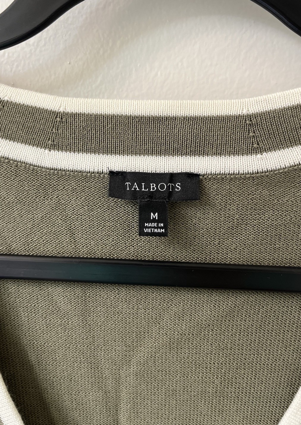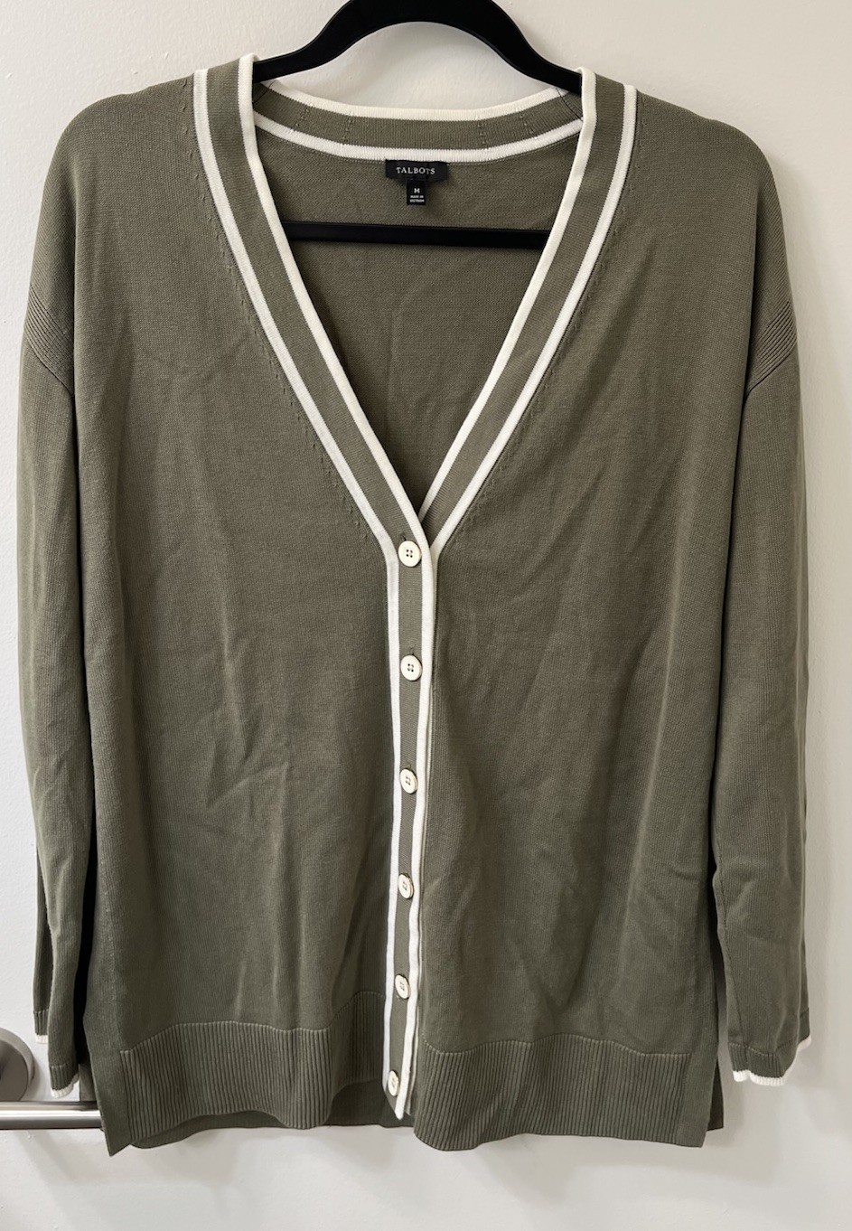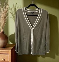 Talbots Cardigan Sweater Size Medium Olive Green white Long Sleeve Button