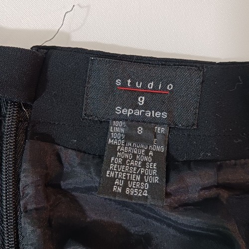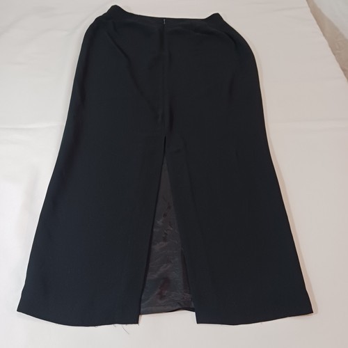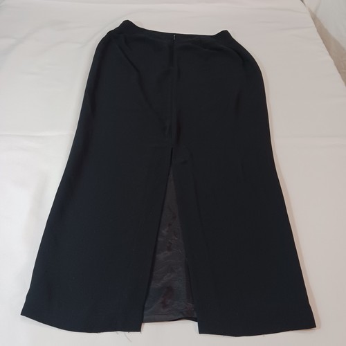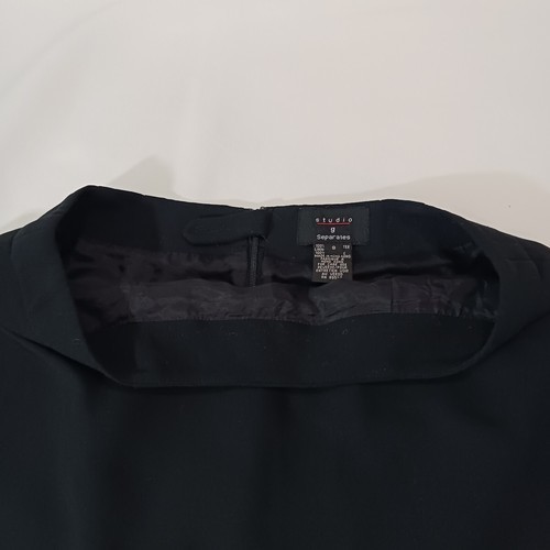 This Studio G women's skirt is a solid black maxi style with a pull-on closure and a back zip for easy wear. The skirt has a slit for added movement and style, with a length of 36 inches, making it a versatile choice for various occasions. Made of polyester, this size 8 skirt by Studio is designed for regular fit and is manufactured in Hong Kong. Perfect for a chic and sophisticated look, this skirt is a fashionable addition to any woman's wardrobe.