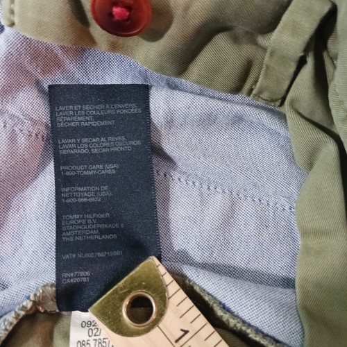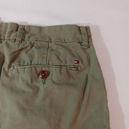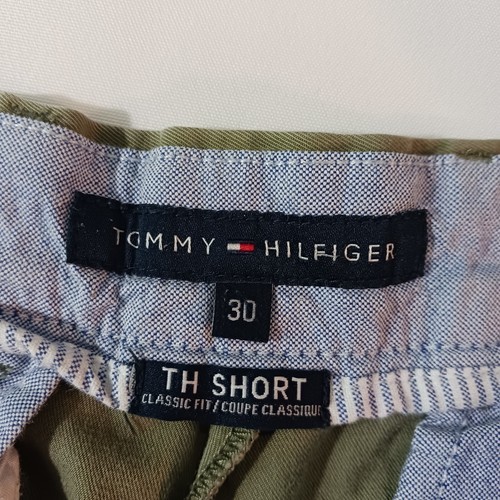 This is a pair of Tommy Hilfiger Classic Fit Bermuda shorts for men, crafted from green cotton material with a light wash. The shorts feature a zip closure, a flat front design, and a regular fit. The waist size is 30 inches, with a size 30 inseam measuring at 10 inches. Ideal for casual occasions, these shorts offer a stylish and comfortable option for everyday wear.