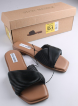 Steve Madden Women's Wall 6 Limitt Sandal de tobogan texturizado en negro. ¡Nuevo en la caja! Slylish Slip-On con un diseño solido con un tacon plano bajo. La sandalia es de Steven de Steve Madden Product Line y tiene una parte superior hinchada de múltiples capas con detalles plisados. Ofrece una suela acolchada para la comodidad y es ideal para el uso de verano.