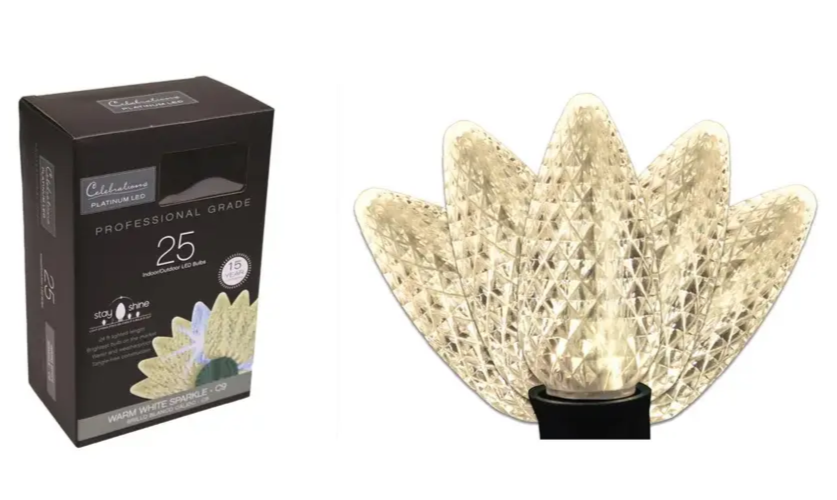 - 25-count warm white C9 faceted LED bulbs with built-in sparkle effect