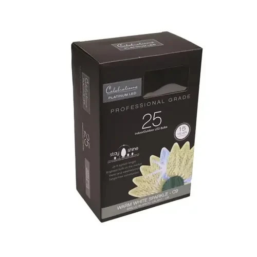 The Celebrations C925FWWSA Platinum LED C9 light string combines the cozy glow of warm white illumination with a festive sparkle effect?every seventh bulb twinkles to mimic the gentle flicker of candlelight or distant stars. Featuring 25 tapered 2-inch faceted LED bulbs spaced 12 inches apart along a 25-foot lighted length, this set delivers rich, inviting ambiance with enhanced light dispersion. The green wire blends seamlessly into outdoor greenery, while UL Listing and Energy Star certification ensure safe, efficient operation. Cool to the touch and connectable up to 45 sets, it?s ideal for wrapping trees, outlining eaves, or creating luminous indoor displays with minimal energy use.